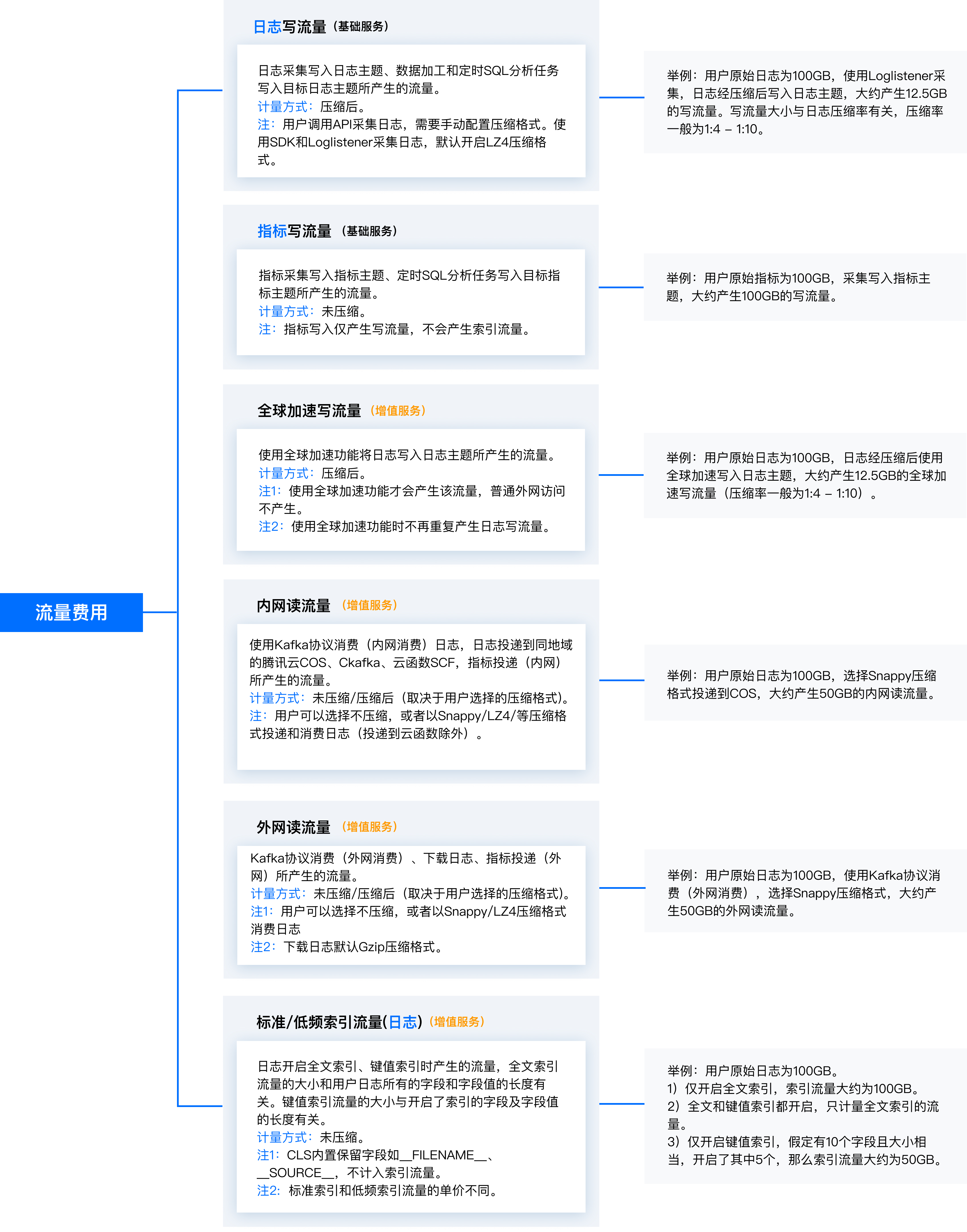 | 内网读流量(增值服务) | 定义:使用 Kafka 协议消费(内网消费)日志,日志投递到同地域的腾讯云 COS、Ckafka、云函数 SCF,指标投递(内网)所产生的流量。 计量方式:未压缩/压缩后(取决于用户选择的压缩格式)。 注:用户可以选择不压缩,或者以 Snappy/LZ4/等压缩格式投递和消费日志(投递到云函数除外)。 | 用户原始日志为100GB,选择 Snappy 压缩格式投递到 COS,大约产生50GB的内网读流量。 |