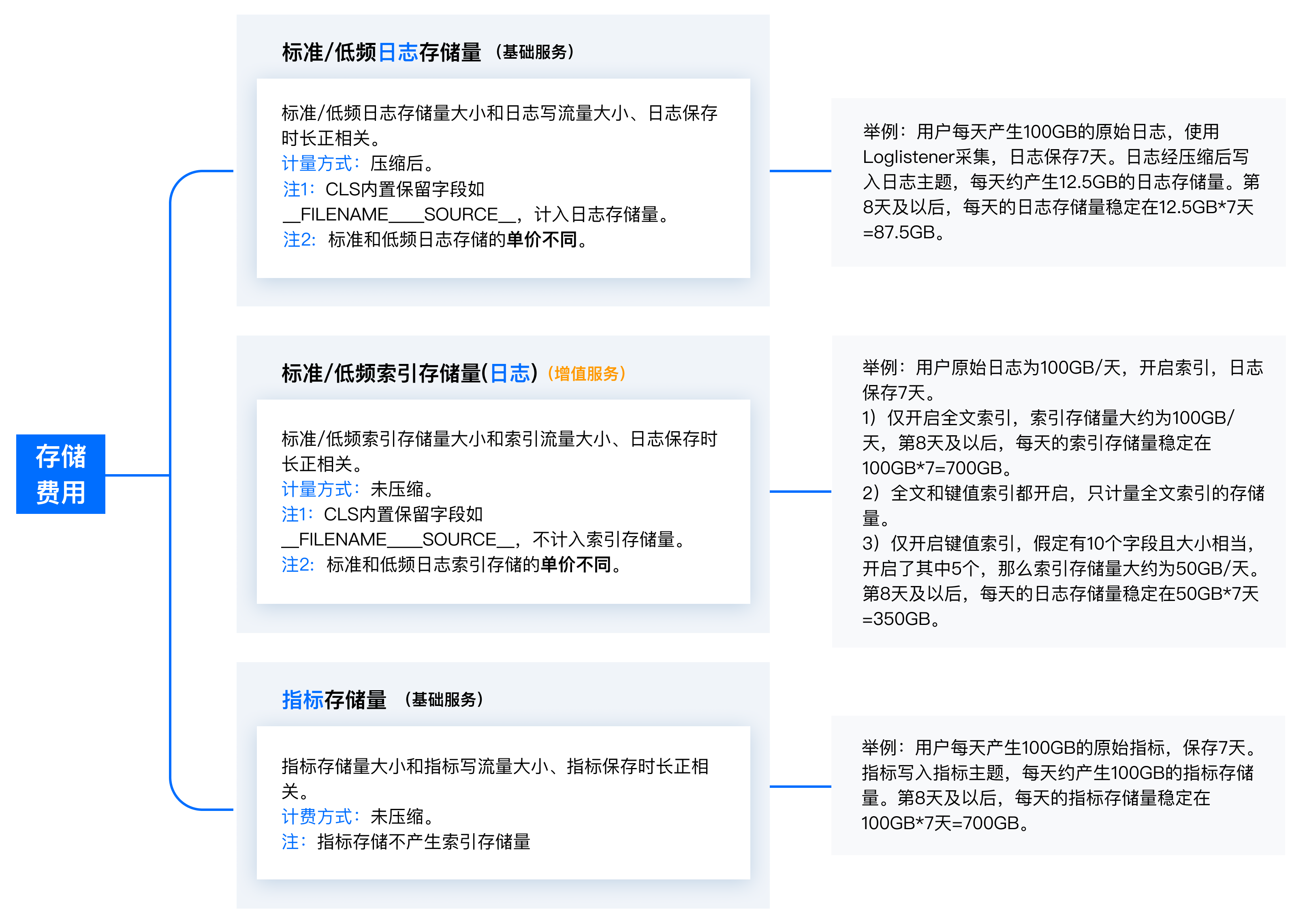 | 日志标准/低频索引存储量 (增值服务) | 定义:标准/低频索引存储量大小和索引流量大小、日志保存时长正相关。 计量方式:未压缩。 注1:CLS 内置保留字段如_FILENAME_、_SOURCE_,不计入索引存储量 注2:标准和低频日志索引存储的单价不同。 | 用户原始日志为100GB/天,开启索引,日志保存7天。 1. 仅开启全文索引,索引存储量大约为100GB/天,第8天及以后,每天的索引存储量稳定在100GB*7=700GB。 2. 全文和键值索引都开启,只计量全文索引的存储量。 3. 仅开启键值索引,假定有10个字段且大小相当,开启了其中5个,那么索引存储量大约为50GB/天。第8天及以后,每天的日志存储量稳定在50GB*7天=350GB。 |