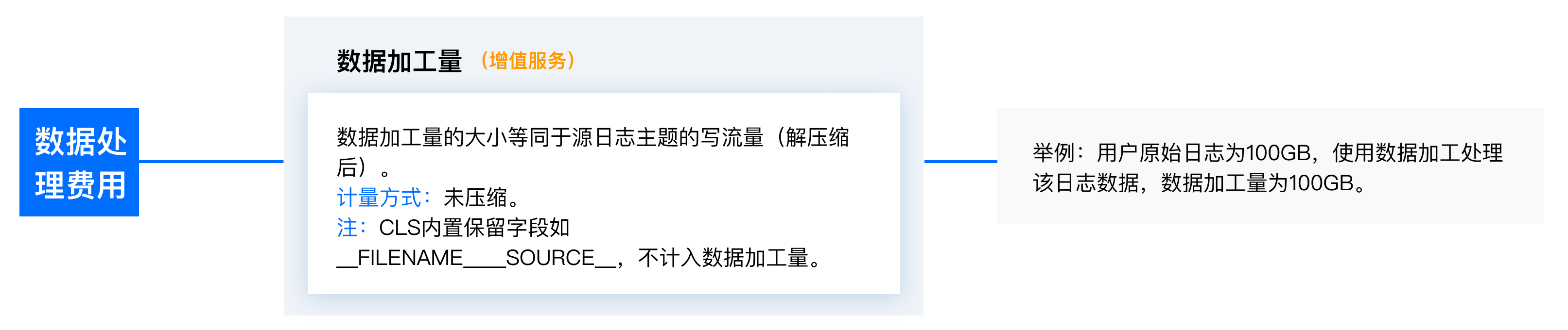 数据处理费用 | 数据加工量(增值服务) | 定义:数据加工量的大小等同于源日志主题的写流量(解压缩后)。 计量方式:未压缩。 注:CLS 内置保留字段如_FILENAME_、_SOURCE_,不计入数据加工量。 | 用户原始日志为100GB,使用数据加工处理该日志数据,数据加工量为100GB。 |