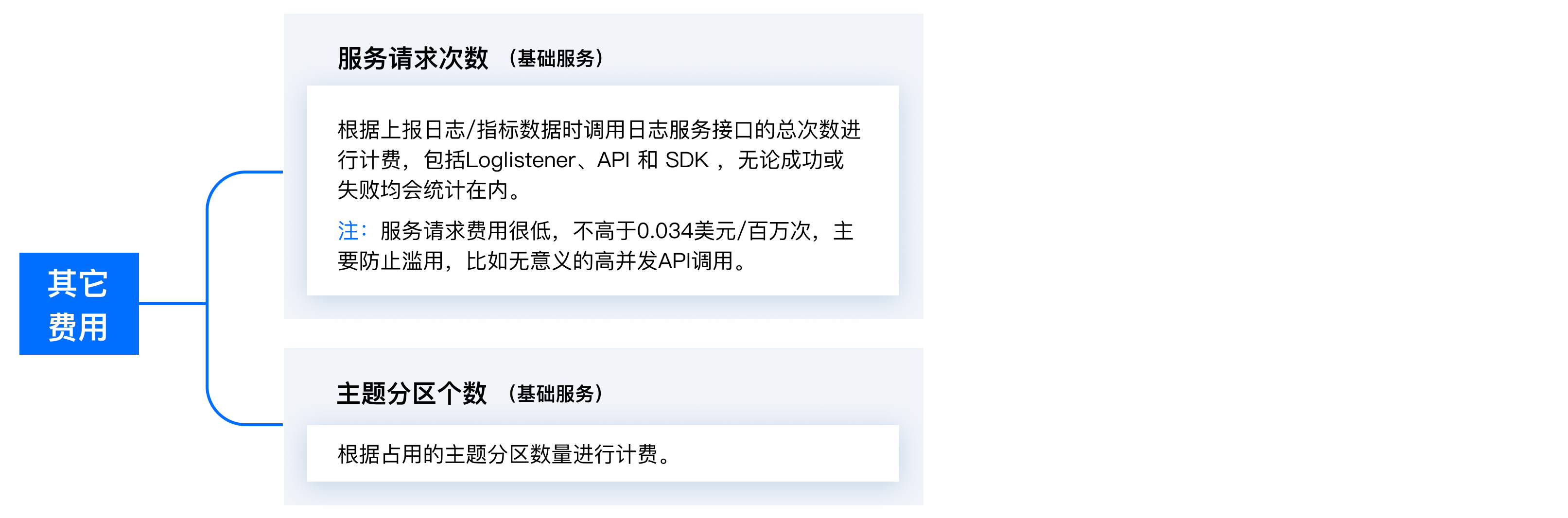 其他费用 | 服务请求次数(基础服务) | 定义:根据上报日志/指标数据时调用日志服务接口的总次数进行计费,包括 Loglistener、API 和 SDK,无论成功或失败均会统计在内。 注:服务请求费用很低,不高于0.034美元/百万次,主要防止滥用,比如无意义的高并发 API 调用。 | 无 |