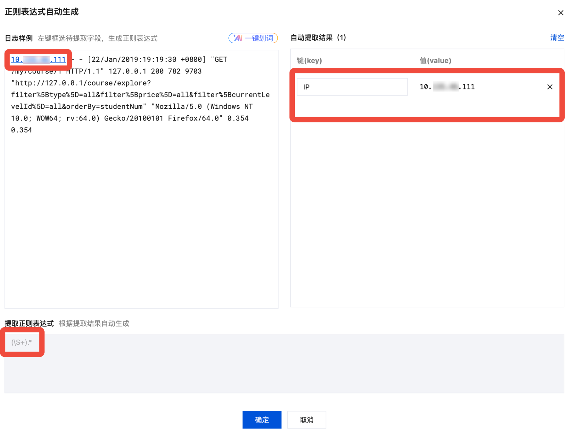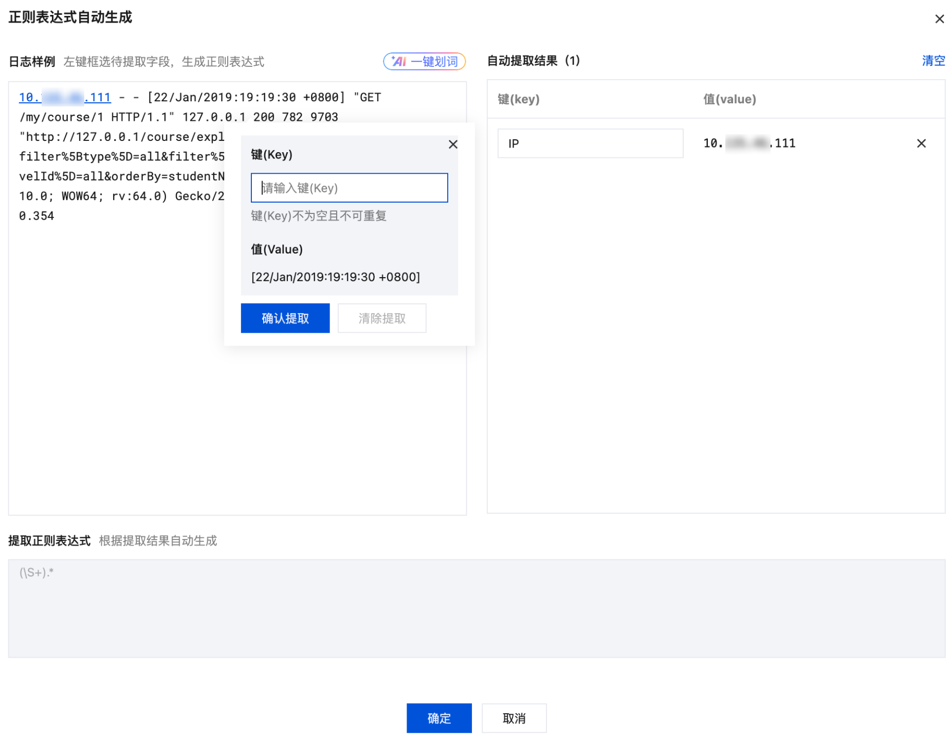4. 单击确定,系统将根据提取好的 key-value 对自动生成完整的正则表达式。
