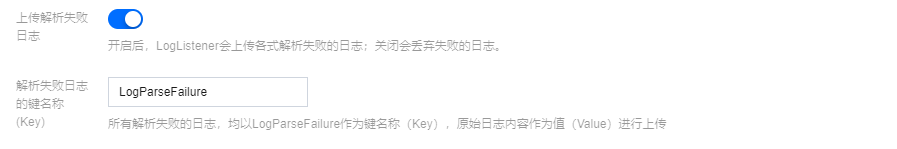 建议开启上传解析失败日志。开启后,LogListener 会上传各式解析失败的日志。若关闭上传解析失败日志,则会丢弃失败的日志。