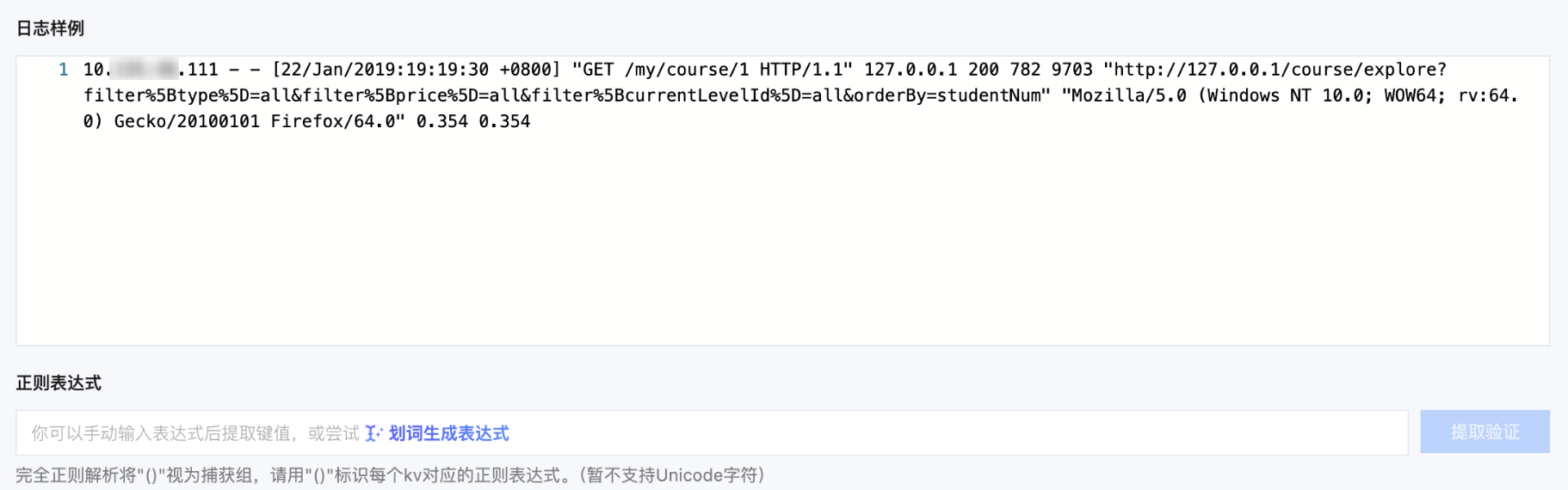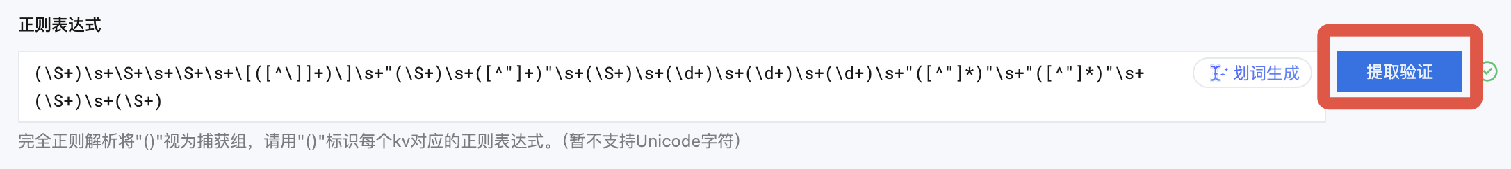 2. 单击提取验证,系统将判断日志样例与正则表达式是否匹配。