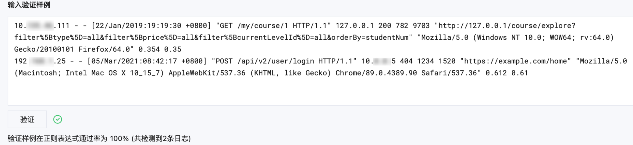 2. 输入待验证日志样例,以换行符分开多条数据,单击验证,系统将验证样例通过率。出现