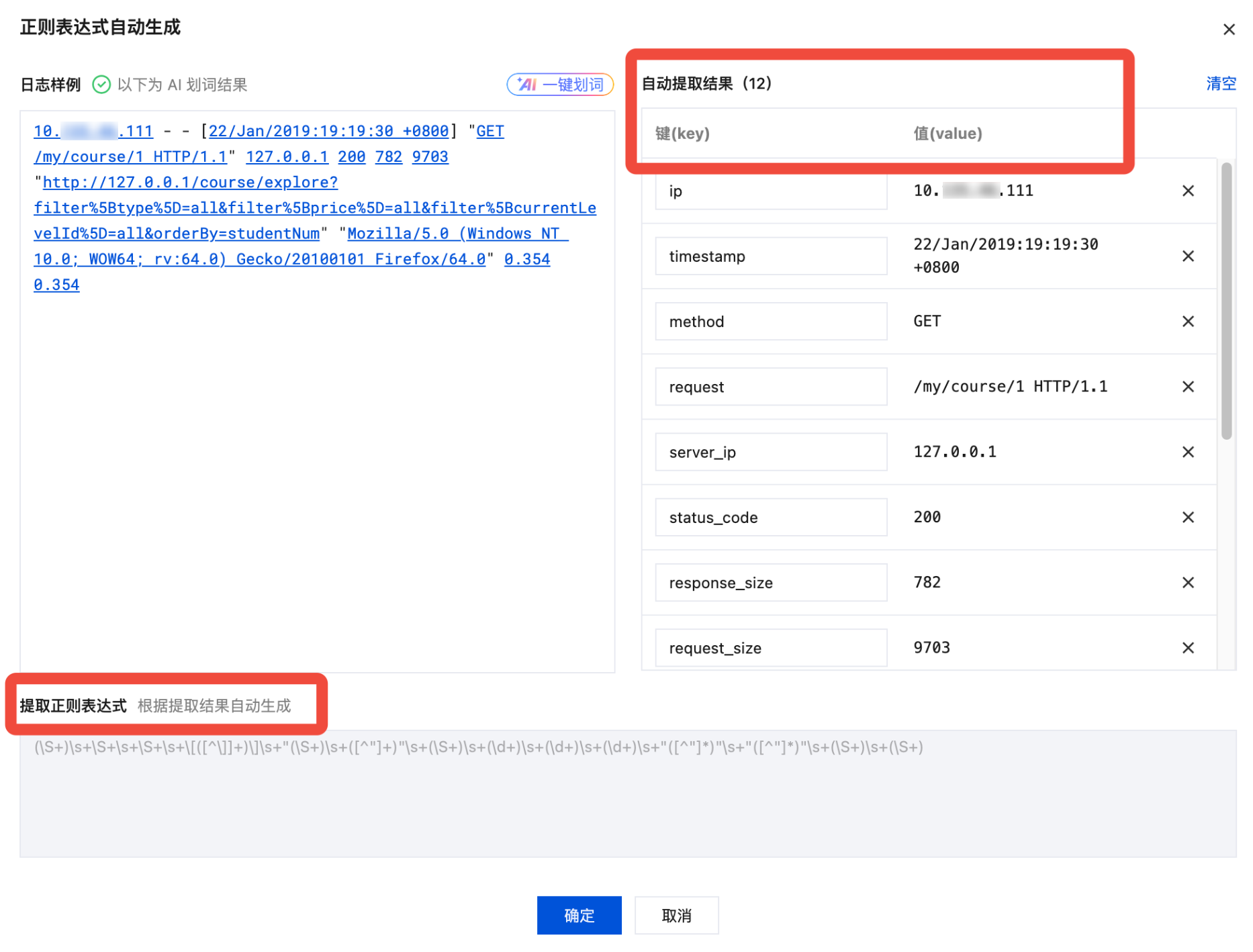 3. AI 将对您的日志进行智能划词,识别出对应的 key-value 结构,并根据值(value),自动生成键( key)。划词结果会在右侧的自动提取结果表格中展示,您可在此对键(key)进行修改。同时系统会根据划词结果自动生成提取正则表达式并显示在下侧表格中。如下图所示: