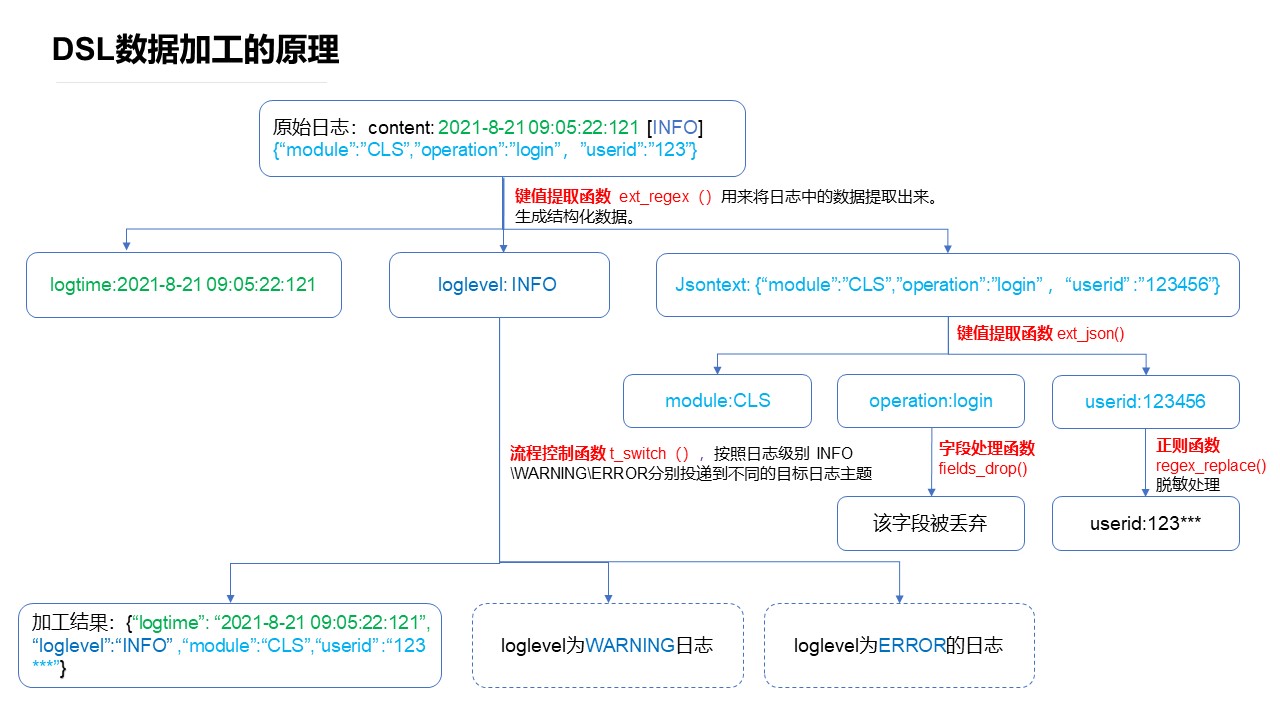 提取 JSON 字符串格式的字段值 | 返回提取后的日志(LOG) ext_json("源字段名",prefix="",suffix="",format="full",exclude_node="不平铺的JSON节点") | 返回提取后的日志(LOG) | |