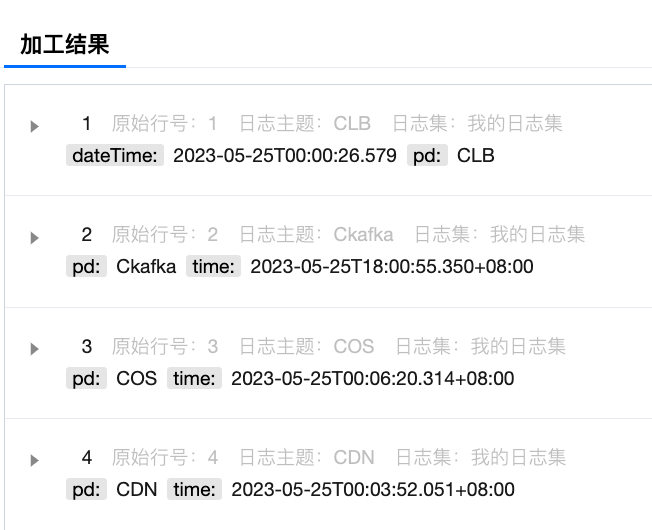 [{"pd": "CLB","dateTime": "2023-05-25T00:00:26.579"},{"pd": "Ckafka","time": "2023-05-25T18:00:55.350+08:00"},{"pd": "COS","time": "2023-05-25T00:06:20.314+08:00"},{"pd": "CDN","time": "2023-05-25T00:03:52.051+08:00"}]