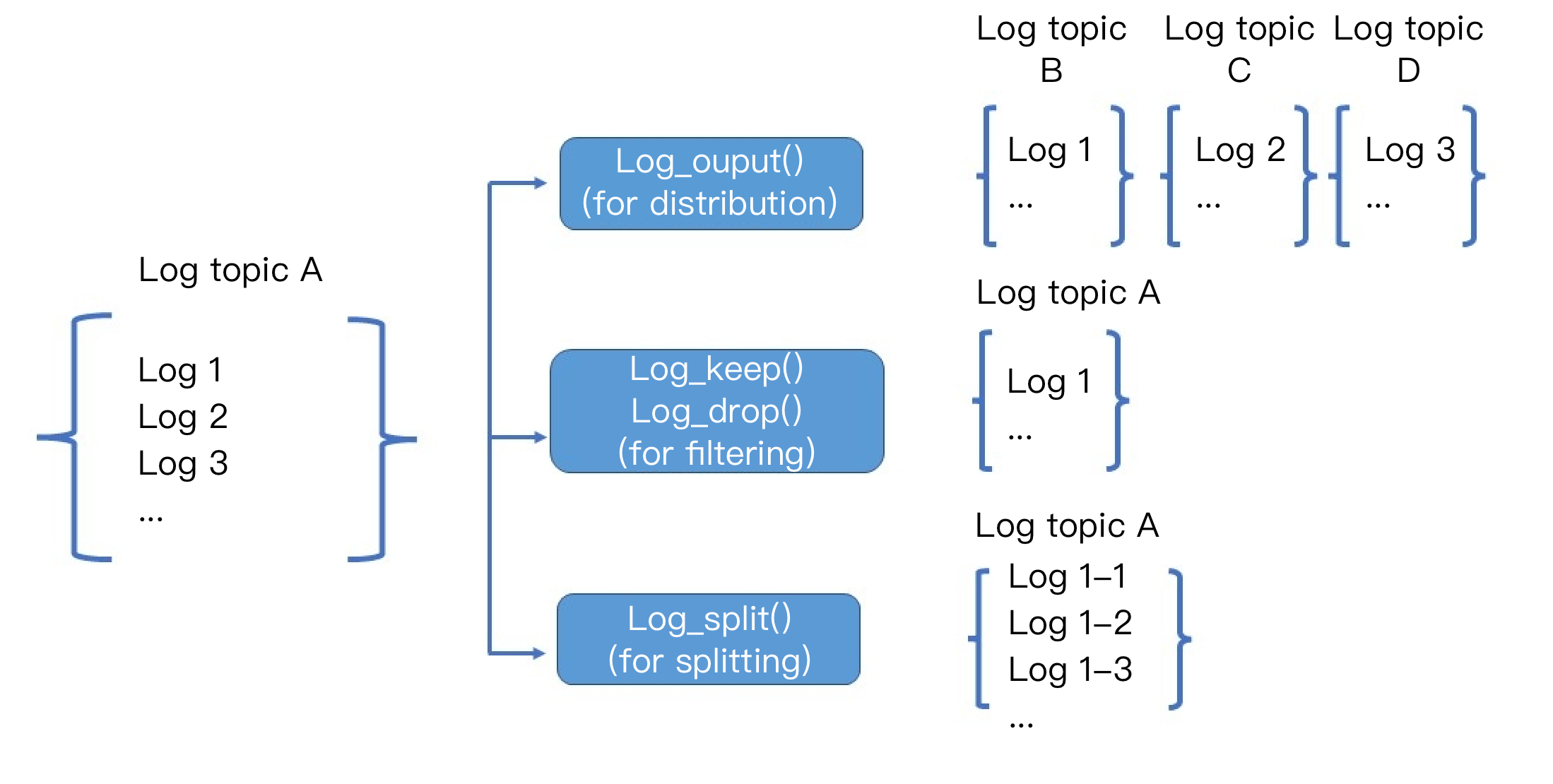 //按照loglevel字段值为waring/info/error的情况,分发到三个不同的日志主题中。t_switch(regex_match(v("loglevel"),regex="info"),log_output("info_log"),regex_match(v("loglevel"),regex="warning"),log_output("warning_log"),regex_match(v("loglevel"),regex="error"),log_output("error_log"))