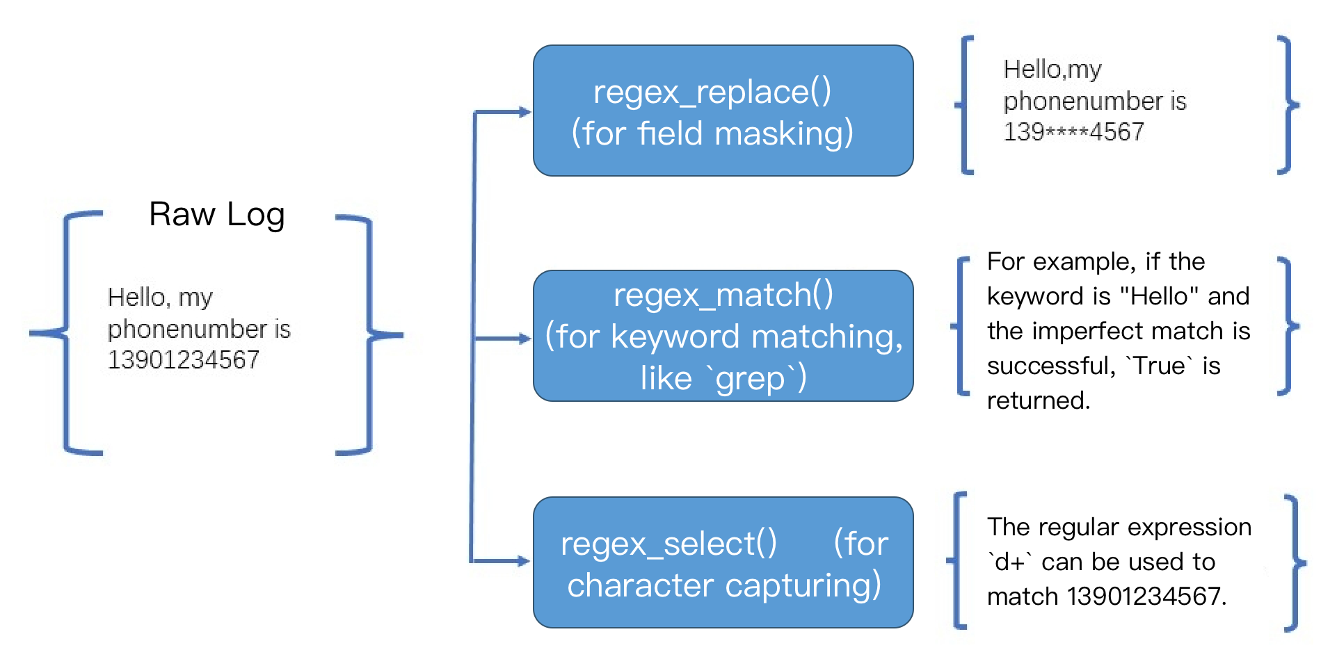//对 Id 字段进行脱敏处理,结果为dev@***45fields_set("Id",regex_replace(v("Id"),regex="\\d{3}", replace="***",count=0))fields_set("Id",regex_replace(v("Id"),regex="\\S{2}", replace="**",count=1))//对 phonenumber 字段进行脱敏处理,将中间的4位数替换为****,结果为139****5678fields_set("phonenumber",regex_replace(v("phonenumber"),regex="(\\d{0,3})\\d{4}(\\d{4})", replace="$1****$2"))//对 IP 字段进行脱敏处理,将第二段替换为***,结果为11.***137.225。fields_set("Ip",regex_replace(v("Ip"),regex="(\\d+\\.)\\d+(\\.\\d+\\.\\d+)", replace="$1***$2",count=0))