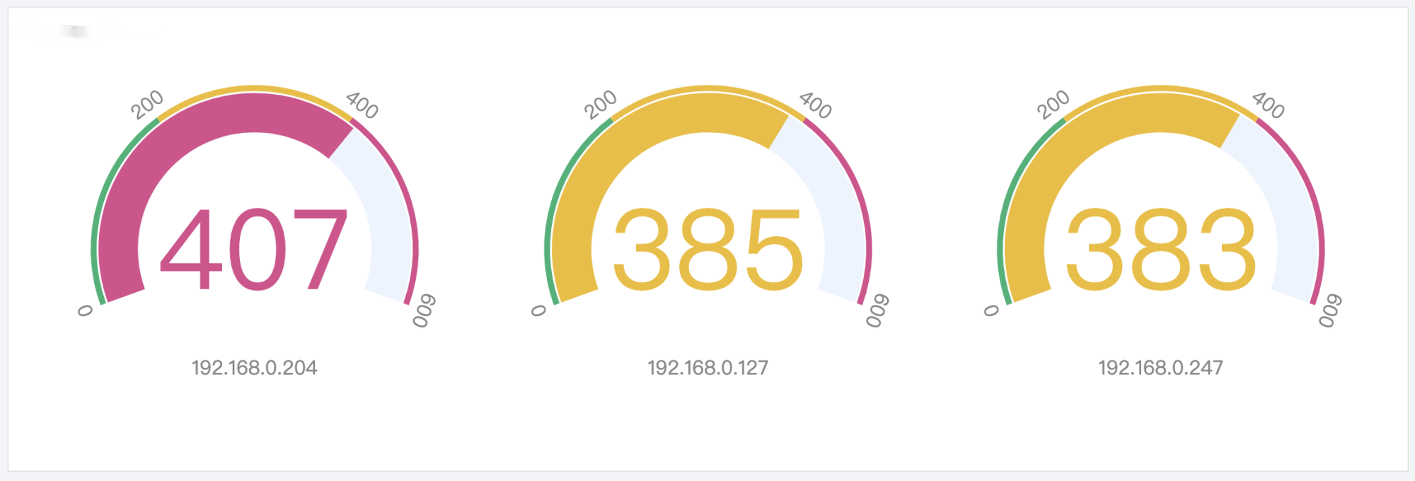 计量仪描述的也是单个指标,但与单值图不同的是,计量仪一般搭配阈值使用,用来衡量该指标的状态。系统健康度监控等有分级标准的场景适用。
