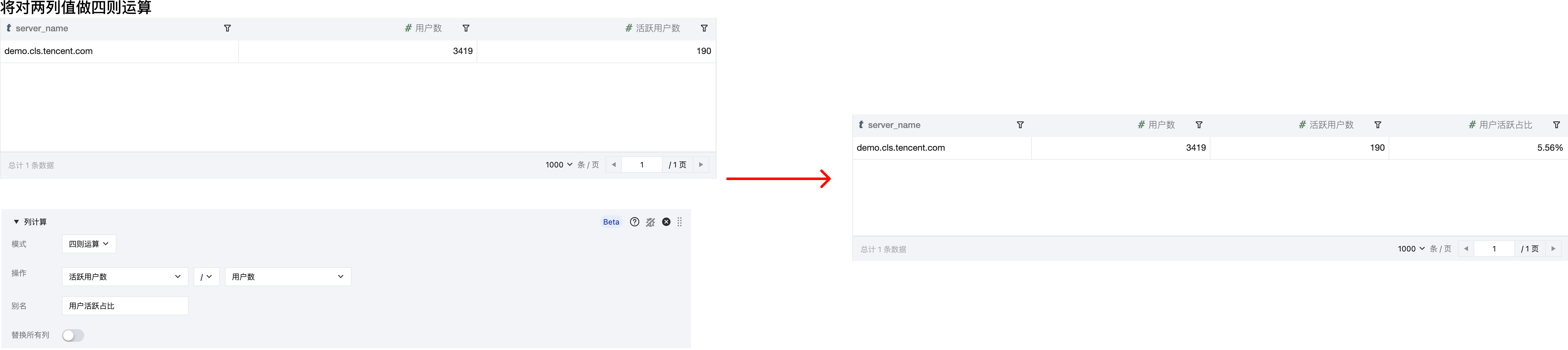 通过列计算,实现两个主题语句合并后的四则运算。例如根据 server_name 合并 A、B 两个主题的语句,得到总用户数和活跃用户数。然后通过列计算,使用 活跃用户数/总用户数 求出用户活跃率。