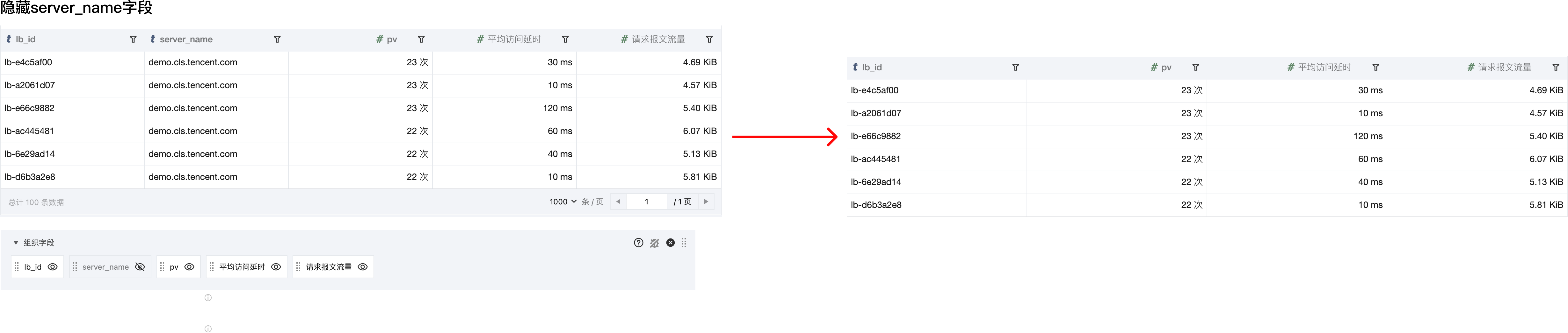 支持字段显示/隐藏,字段排序。例如隐藏 server_name 字段。