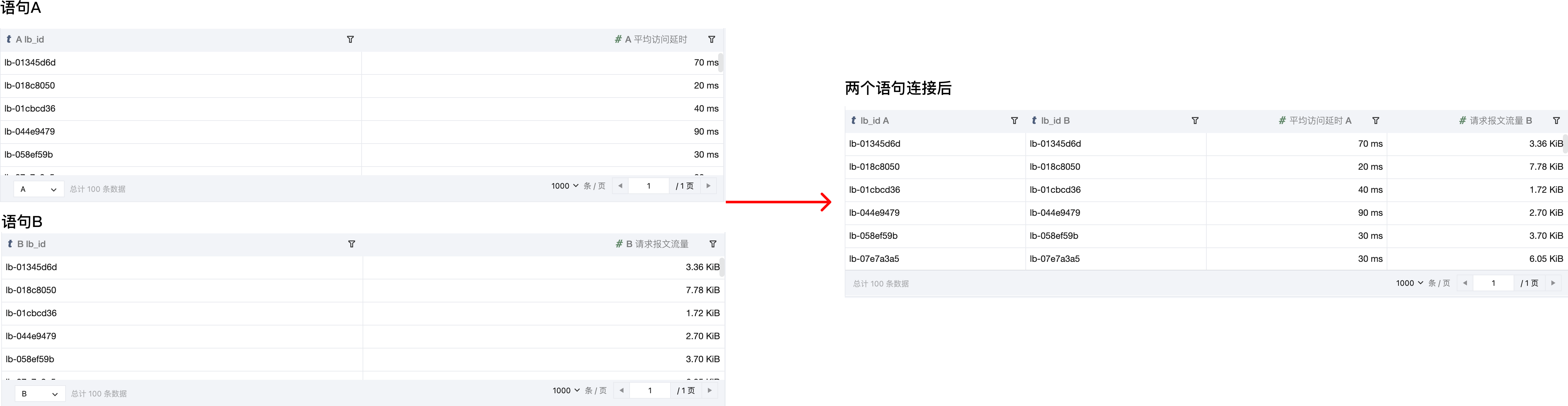 支持将多个语句多个主题的结果合并为一个结果。例如,根据 lb_id 字段连接两个查询结果,合并请求报文流量、平均访问延时到一个结果中。