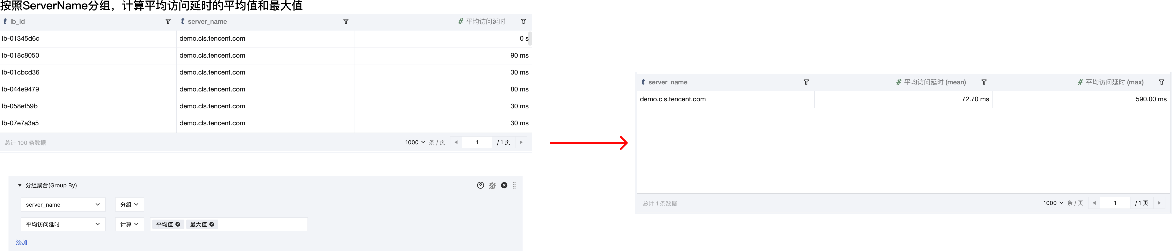 根据指定的字段对查询分析结果进行分组合并,并对合并后的组做聚合计算。例如,根据 server_name 字段分组,忽略 lb_id 字段,并对各组平均访问延时求平均值与最大值。