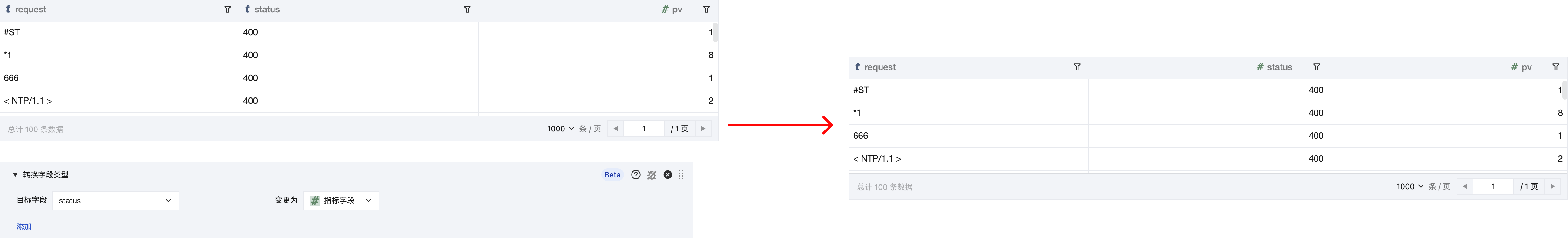 修改字段类型,例如将 status 字段由 number 类型转换为 string 类型。