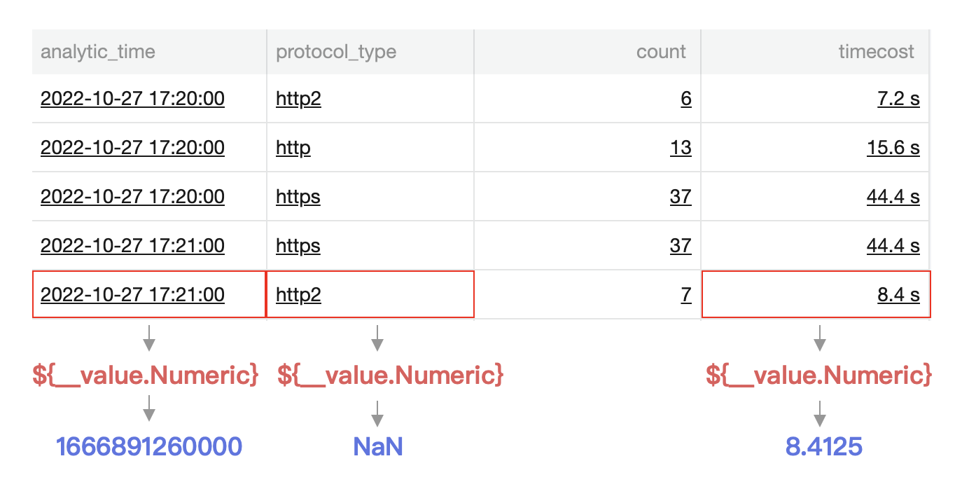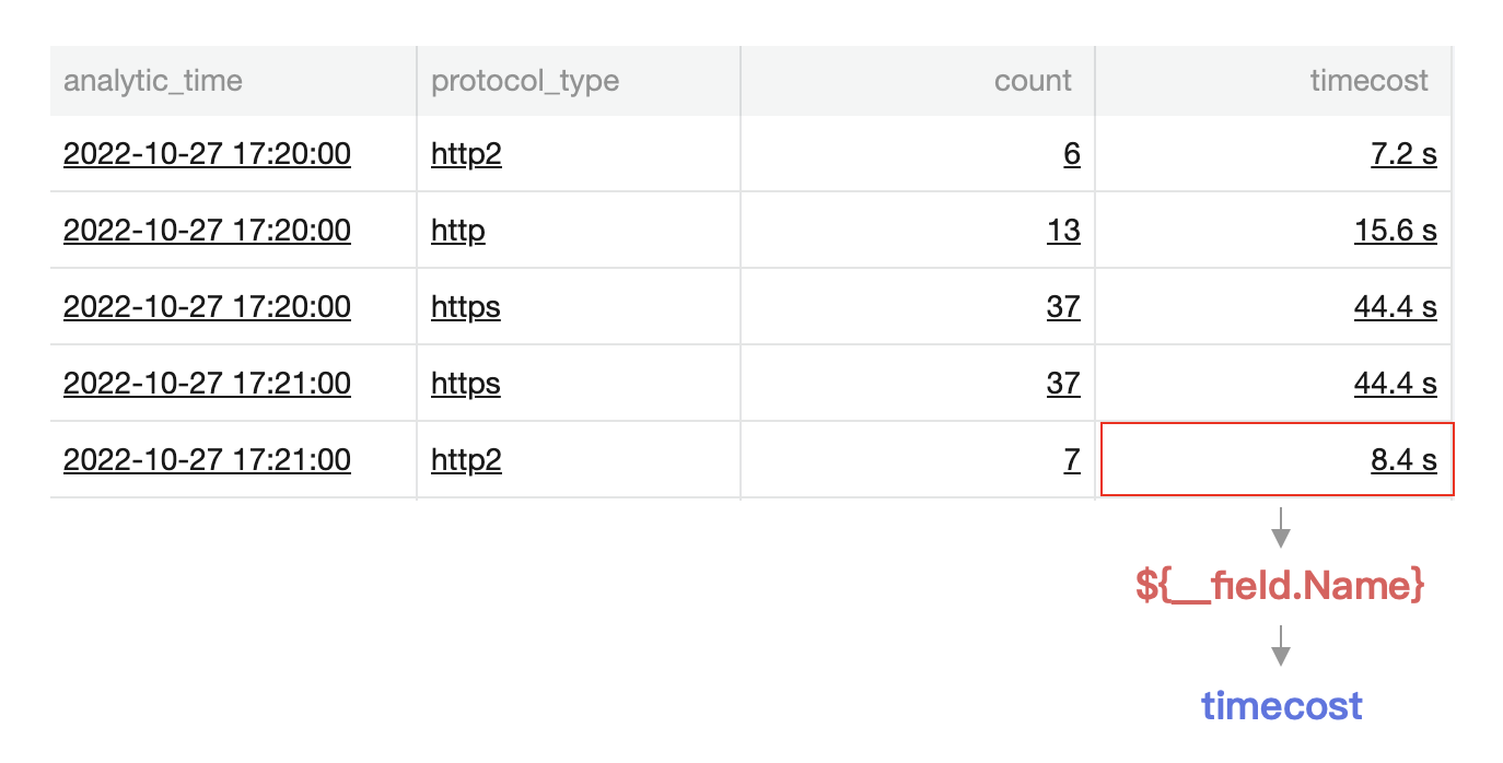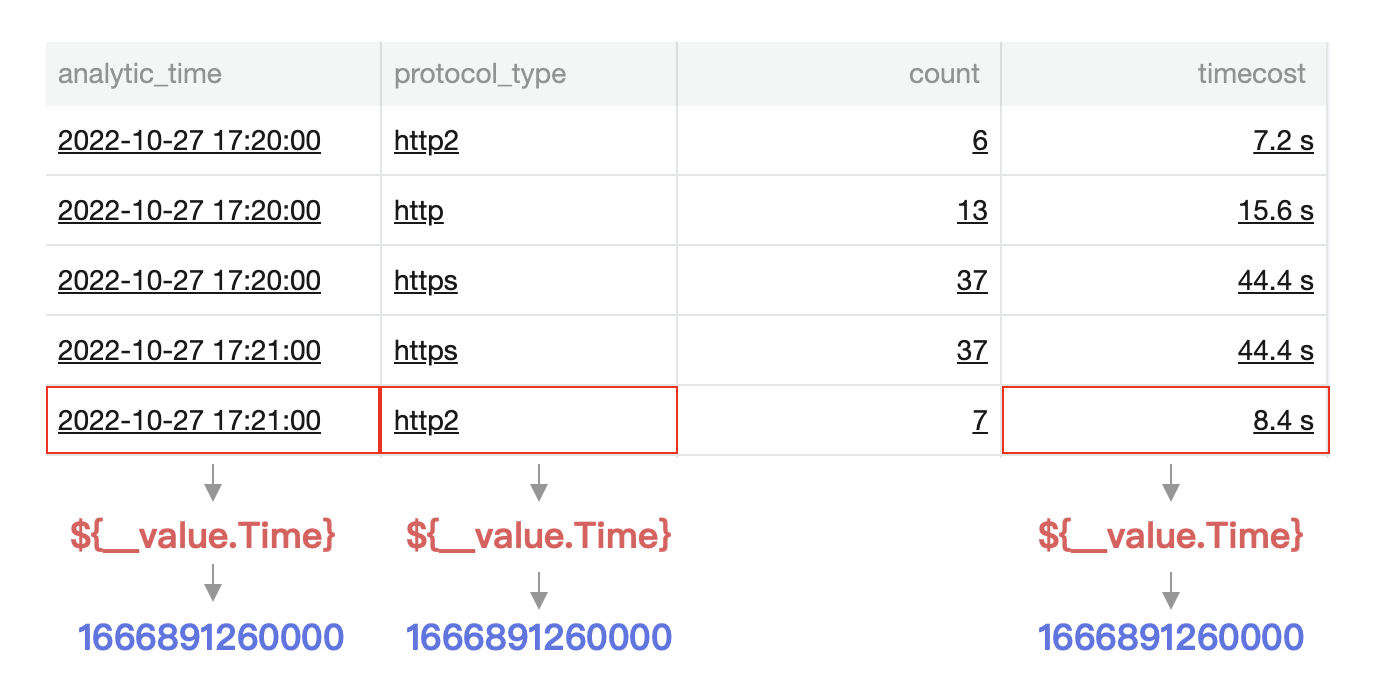 如下图所示,单击 8.4s 触发跳转链接,链接中嵌入了 ${__value.Time} 变量,将会引用被单击值同行的时间戳,即 analytic_time 的值2022-10-27 17:21:00,并转为 Unix 格式填充为1666891260000。若所在行无时间戳,则引用失败。