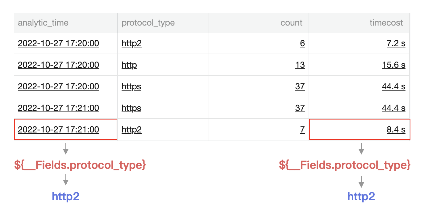 如下图所示,单击 8.4s 触发跳转链接,链接中嵌入了 ${__Fields.protocol_type} 变量,将会引用被单击值同行该字段的值,即 protocol_type 的值 http2。
