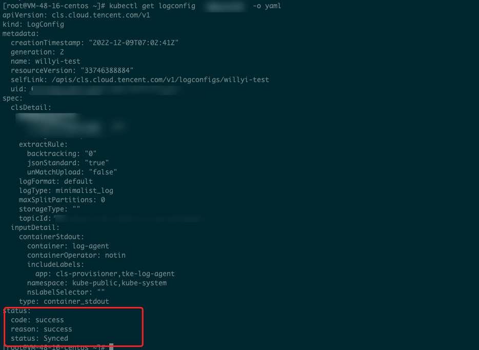 查看 logconfig 同步的状态,status 非 Synced 状态都是异常的,异常信息会在 reason 里面,正常都是 success 的状态。