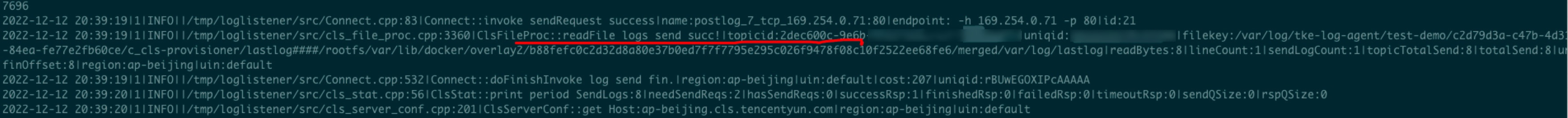 确定是否有如上图所示类似 readFile logs send succ!|topicid 的字样,如果有,则表示日志成功采集到对应的 topic 了;如果没有如上的字样,那说明采集有问题,可以联系相关研发人员。