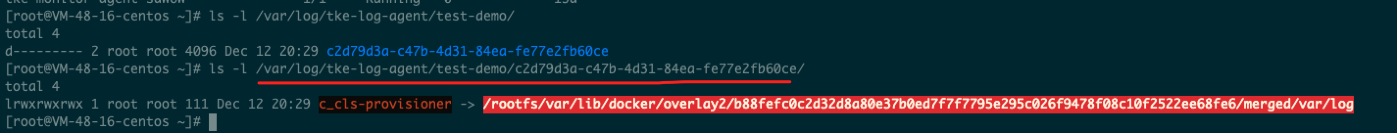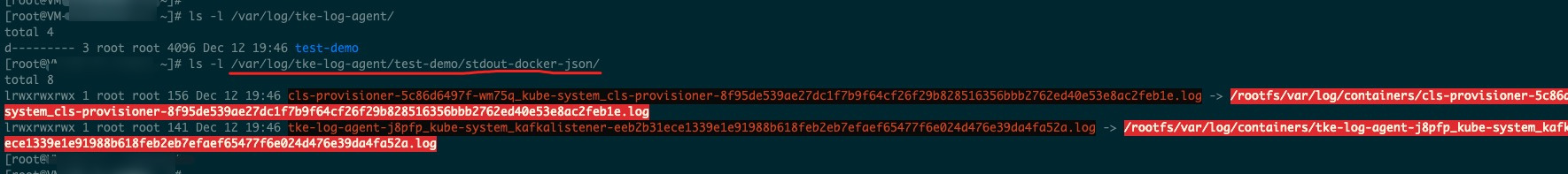 会在 /var/log/tke-log-agent/<采集配置名称(logconfig 名称)>/stdout-docker-json 下创建需要采集的 Pod 的标准输出日志的软连,创建好之后才能正常采集。