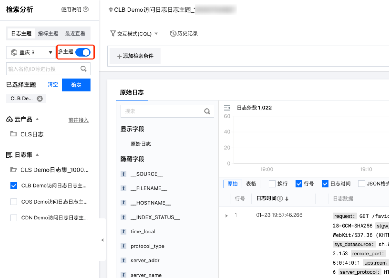 3. 开启左上角的多主题,进入多主题检索模式,然后选择需要检索的多个日志主题,单击确定。