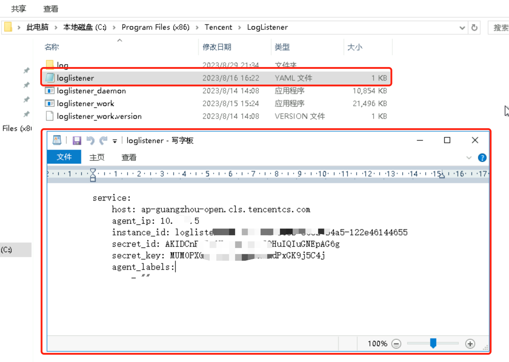 C:\\Program Files (x86)\\Tencent\\LogListener为例,在安装目录下找到 loglistener.yaml 并用任意编辑器打开: