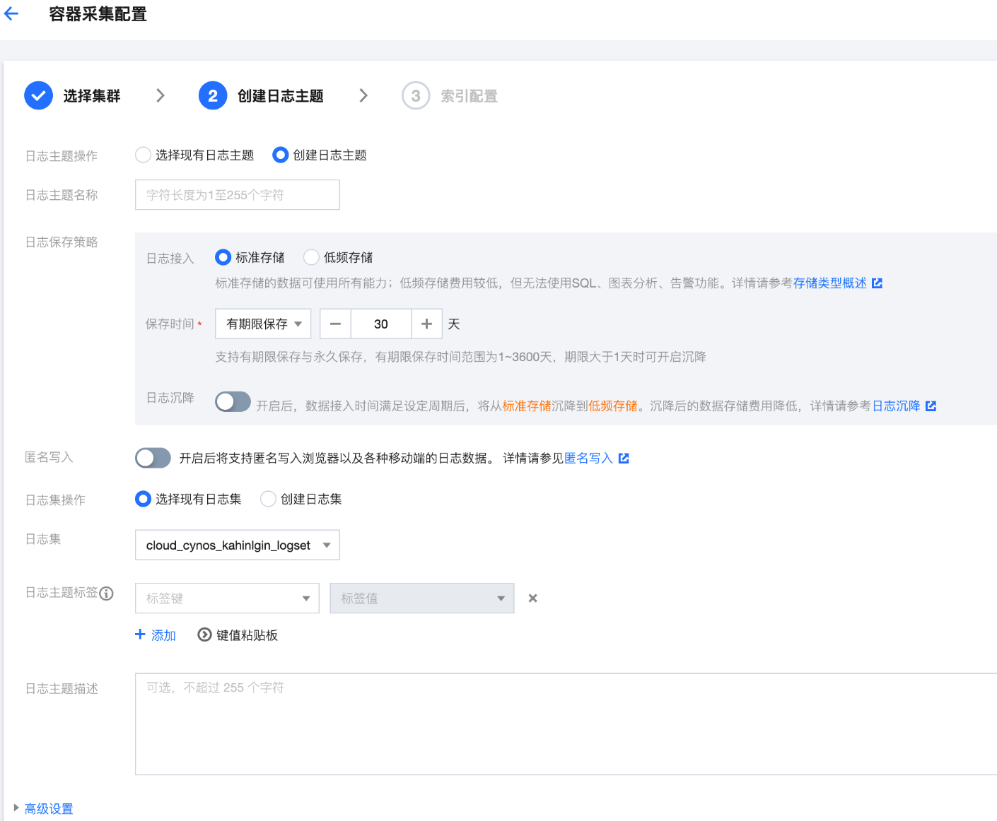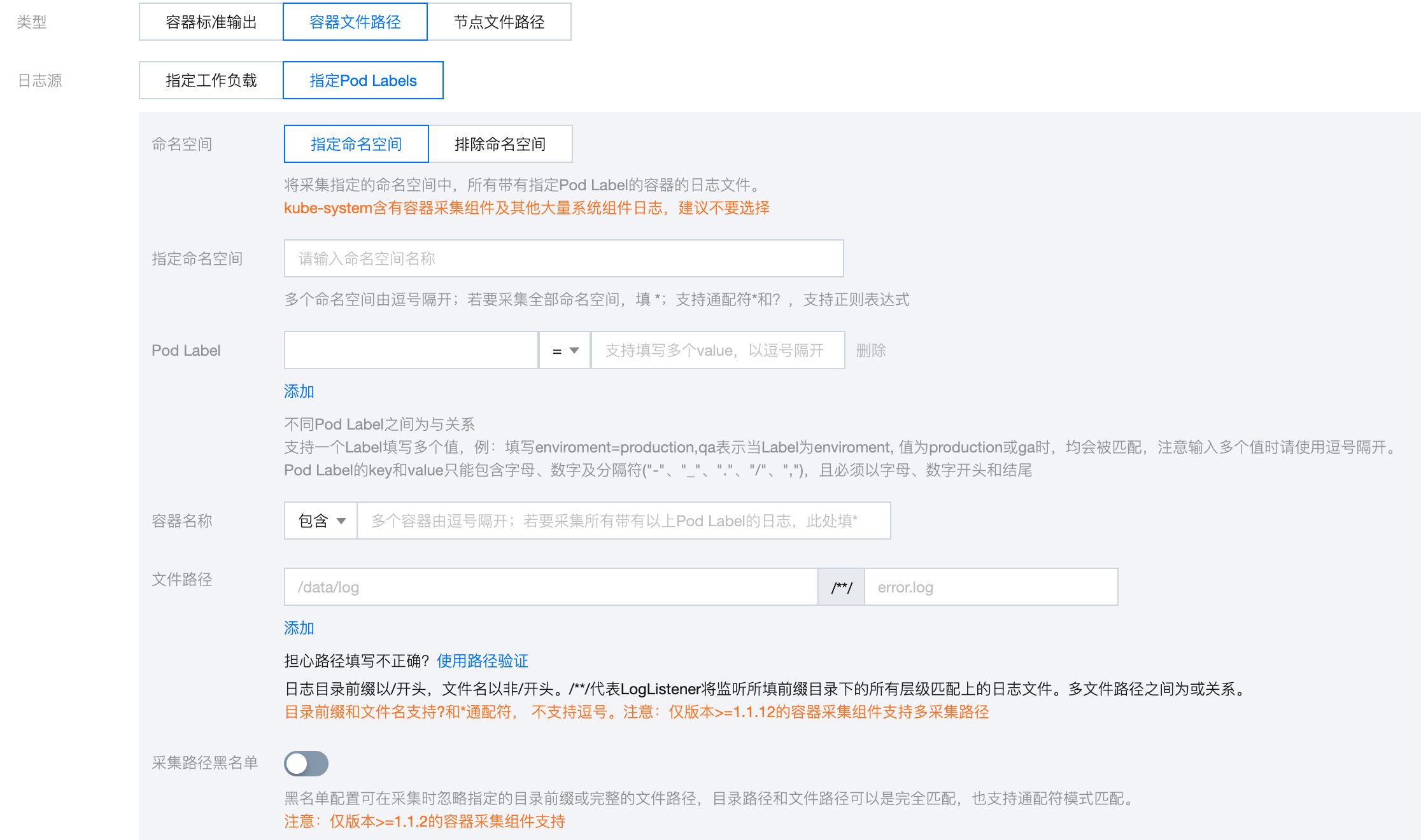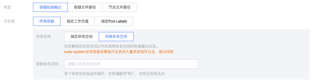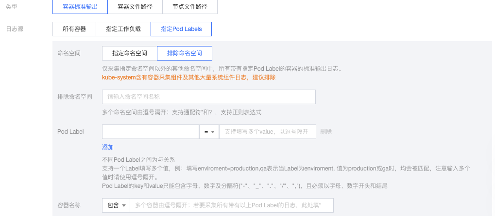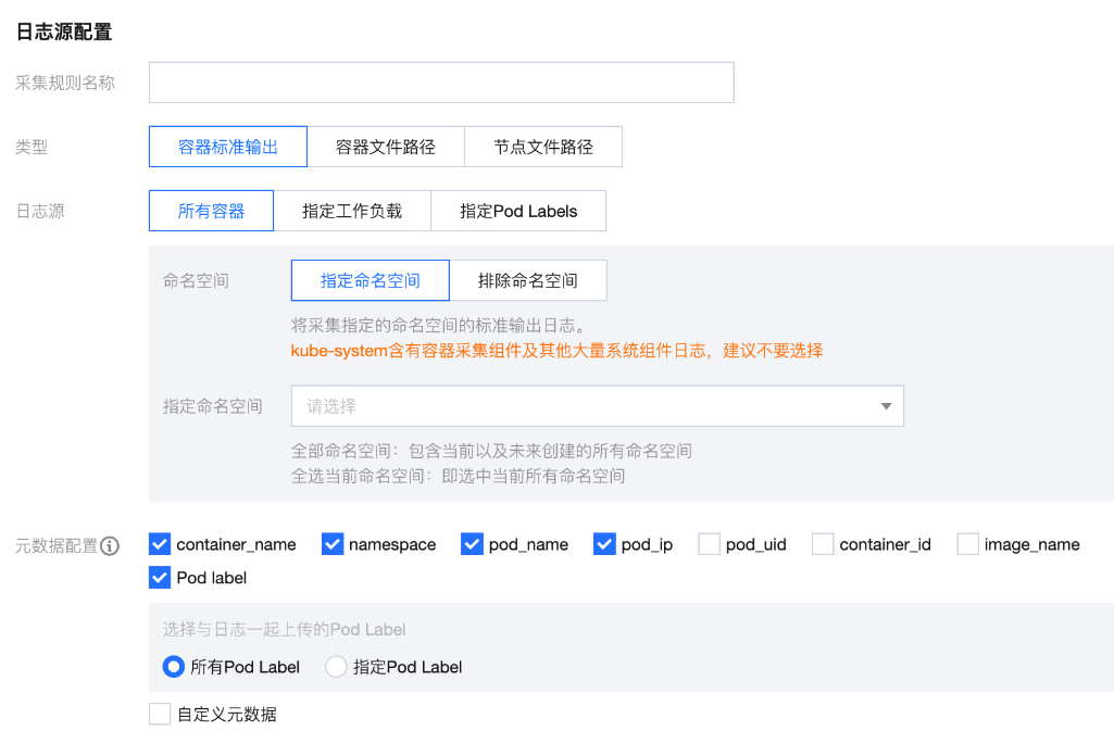 pod_lable_{label name} | 日志所属 pod 的 label(例如一个 pod 带有两个 label:app=nginx,env=prod,则在上传的日志会附带两个 metadata:pod_label_app:nginx,pod_label_env:prod)。 |