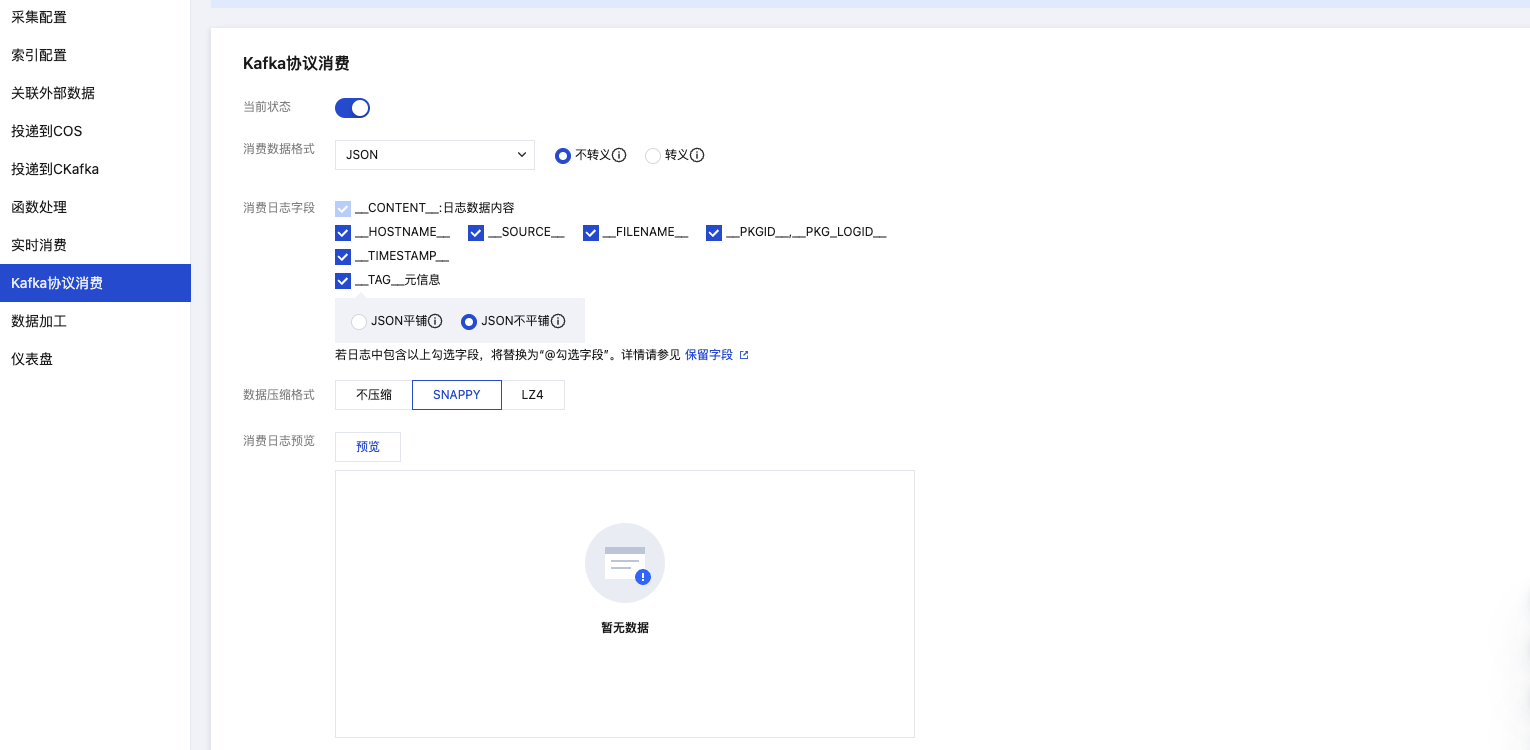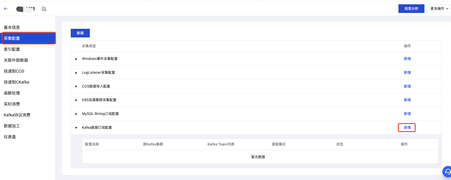 9. 在日志主题详情页中,选择采集配置,单击 Kafka 数据订阅配置右侧的新增,如下图所示: