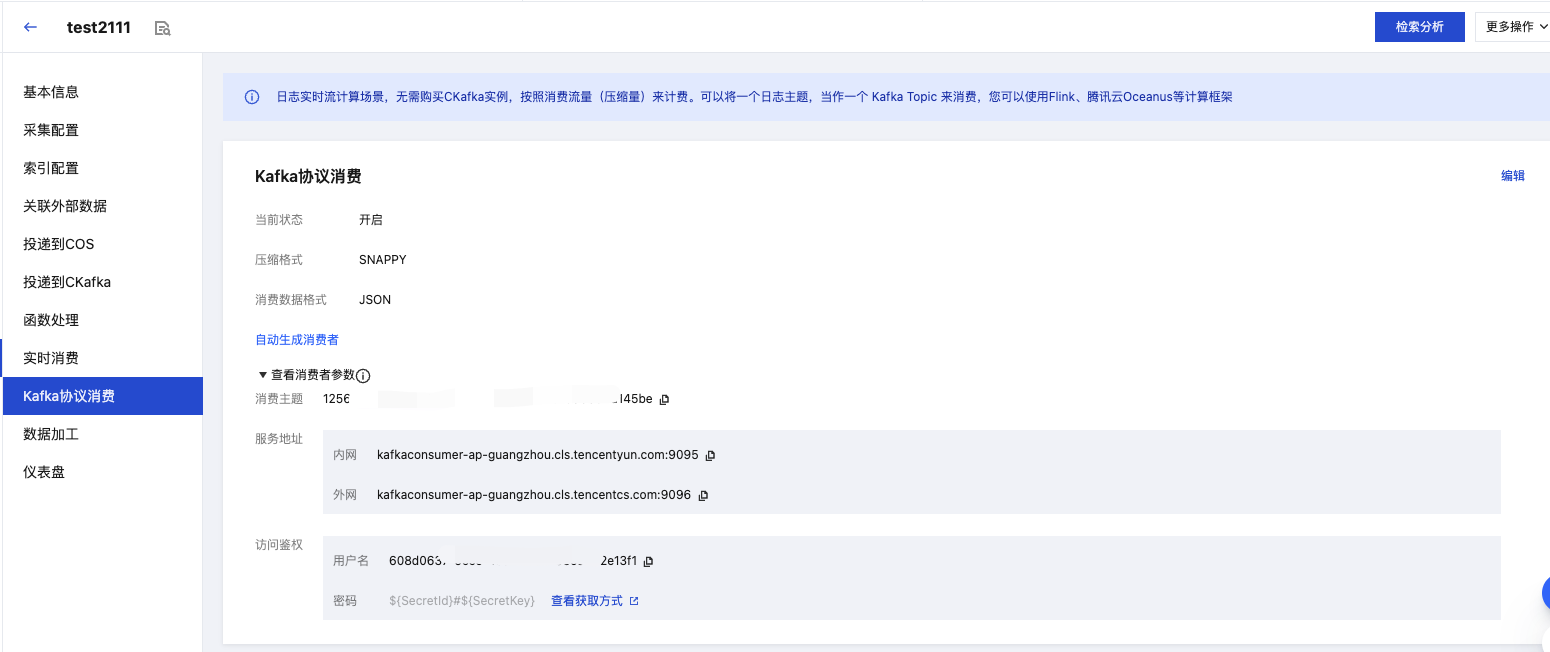 5. 完成配置后,单击确定后,您会看到该日志主题作为 Kafka 消费端的 Kafka Topic ID,Kafka 服务域名。将 Kafka Topic ID 与 Kafka 服务域名记录下来。