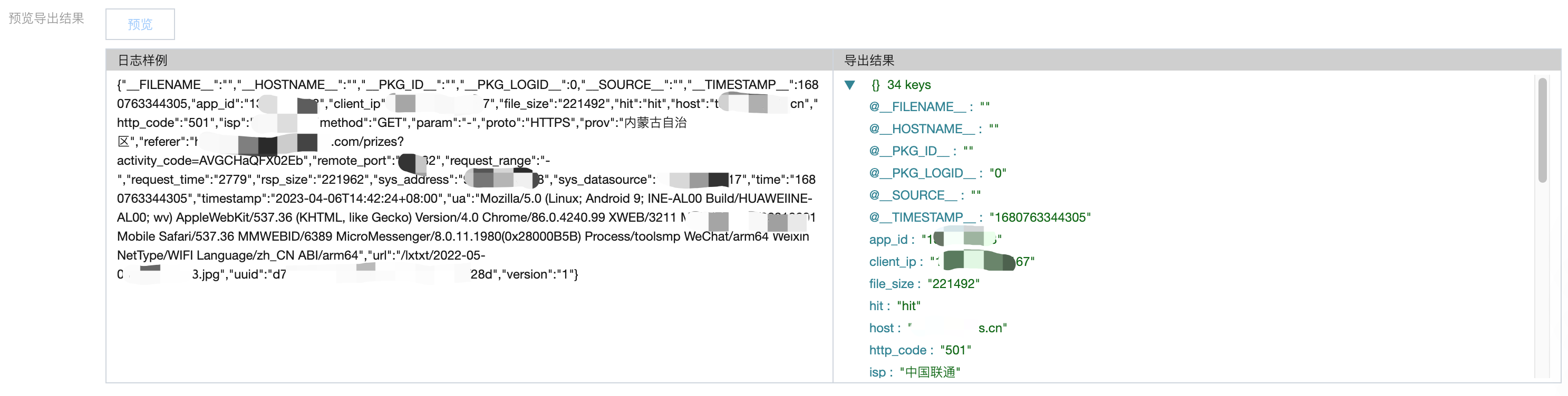 过滤器 | 否 | 过滤器的目的是根据业务需要添加日志采集过滤规则,以帮助您筛选出有价值的日志数据。支持以下过滤规则: 等于:仅采集指定字段值匹配指定字符的日志。支持完全匹配,或正则匹配。 不等于:仅采集指定字段值不匹配指定字符的日志。支持完全匹配,或正则匹配。 字段存在:仅采集指定字段存在的日志。 字段不存在:仅采集指定字段不存在的日志。 例如,您希望原始 JSON 格式日志内容中 response_code 为400或500的所有日志数据被采集,那么 key 处配置 response_code,过滤规则选择等于,value 处配置400|500。 注意: 多条过滤条件之间关系是"与"逻辑,若同一 key 名配置多条过滤条件,规则会被覆盖。 |