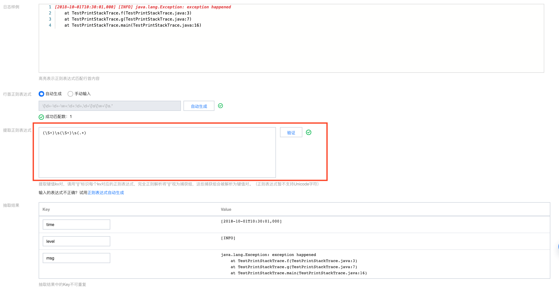 手动验证 | 否 | 若数据提取模式选择为单行完全正则,可选择额外填写单条或多条日志样例来验证正则表达式的正确性。 |