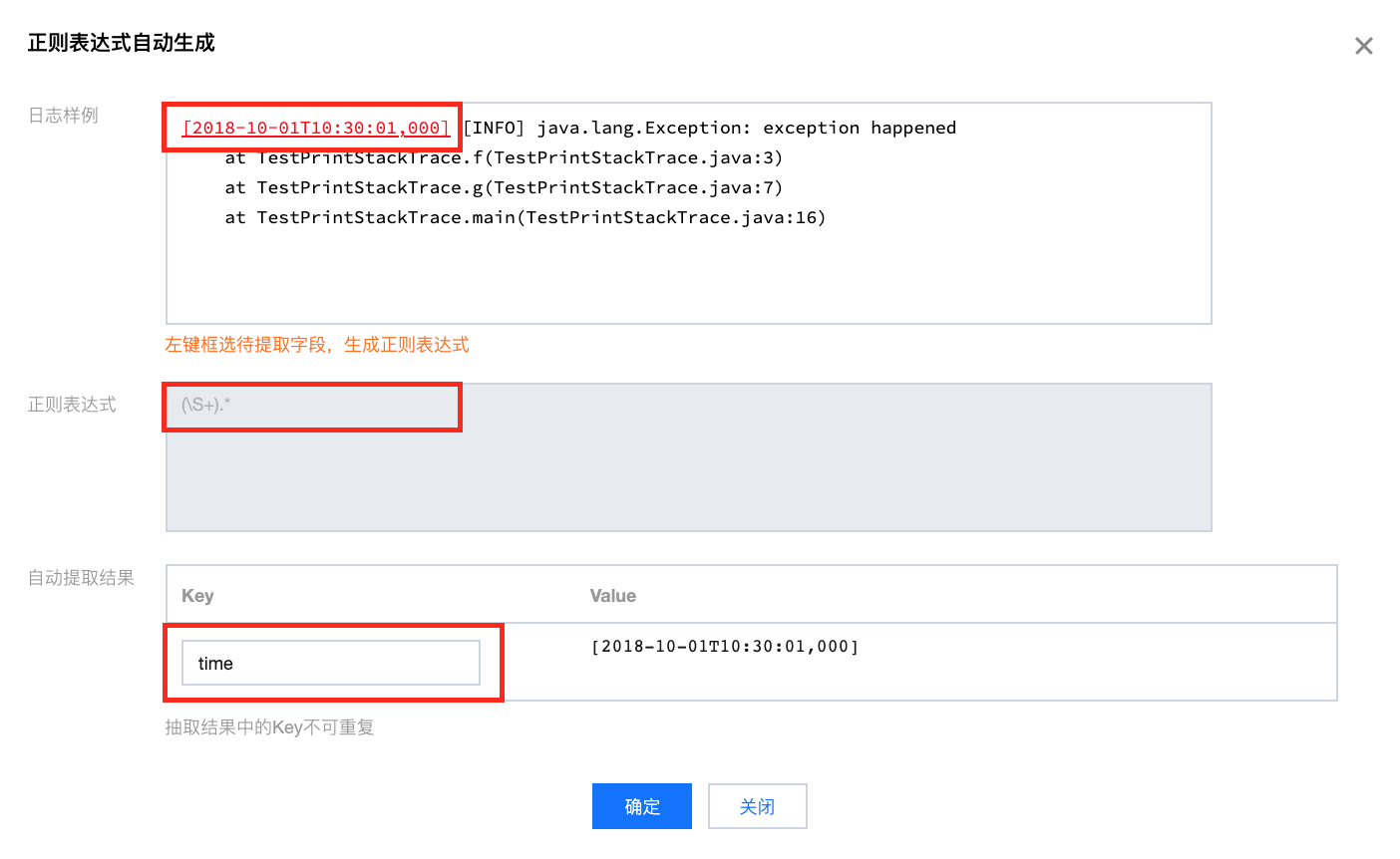 时间提取正则 | 是 | 当关闭了使用默认时间,且数据提取模式单行全文时,您可通过正则表达式定义日志中代表时间的字段。 注意:若正则匹配到多个字段, 将使用第一个。 例子:日志原文为:message with time 2022-08-08 14:20:20,则您可以设置提取时间正则为\\d\\d\\d\\d-\\d\\d-\\d\\d\\d\\d:\\d\\d:\\d\\d |