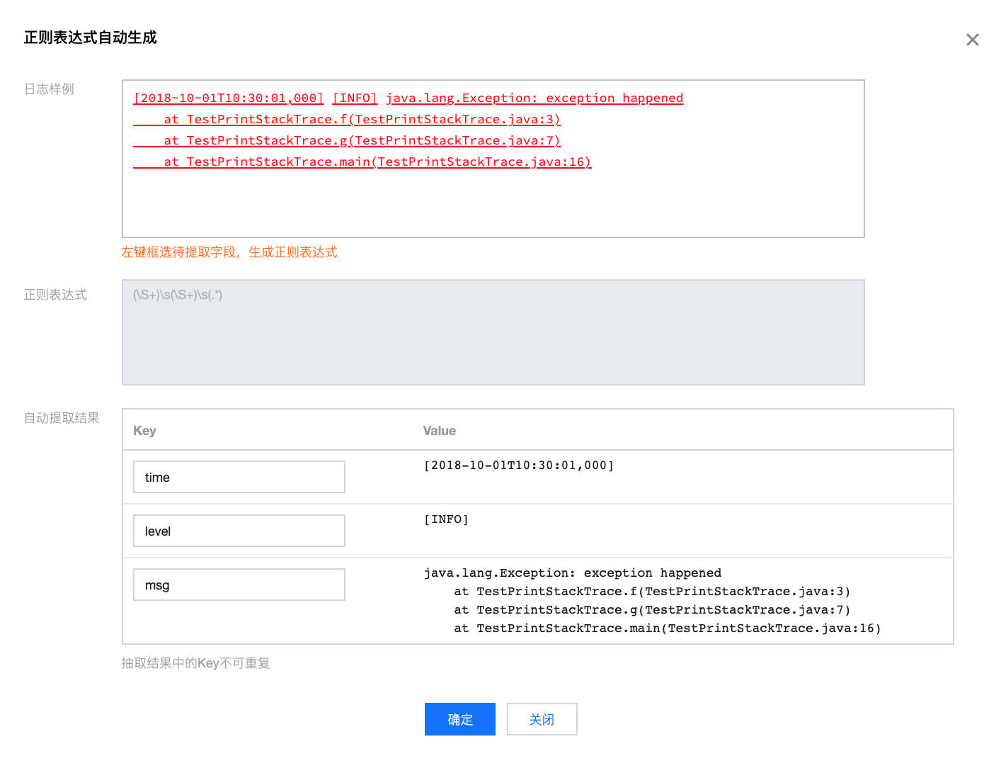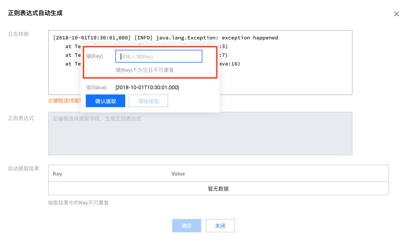 日志样例 | 是 | 若数据提取模式选择为单行完全正则,需手动填写或自动获取一条日志样例,用于验证正则表达式,并提取键值。 |