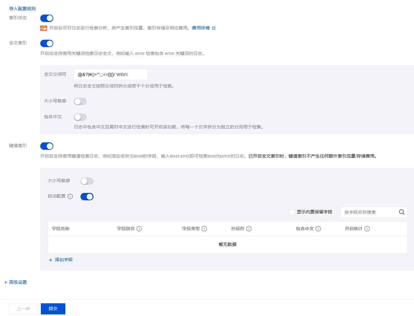 开启统计 | 开启后可对该字段使用 SQL 进行统计分析,text 类型字段开启统计时,如果值过长,仅前32766个字符参与统计运算。 开启统计不会额外产生费用,建议您开启。 |
