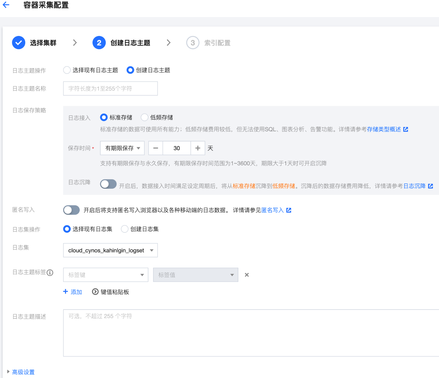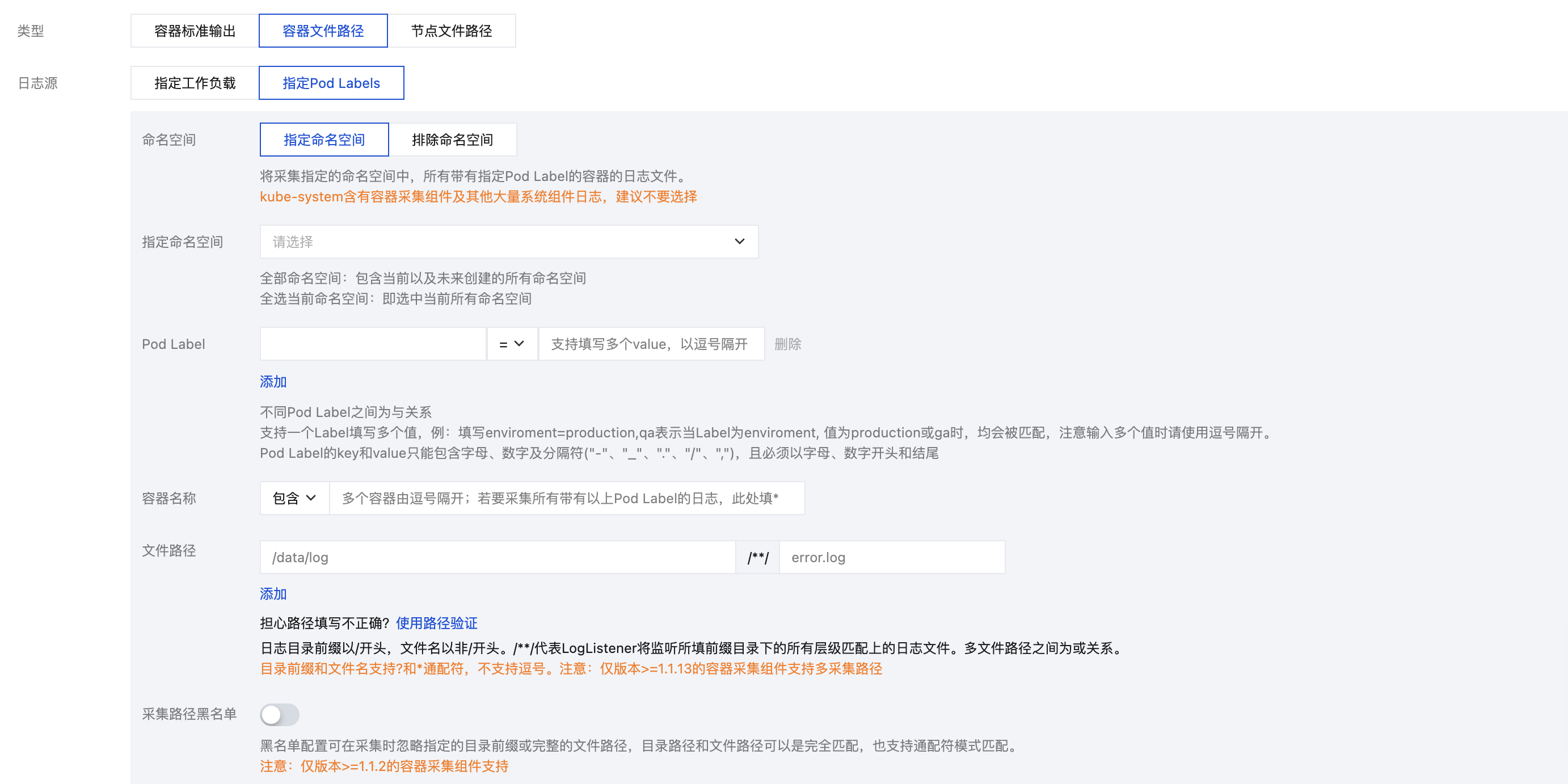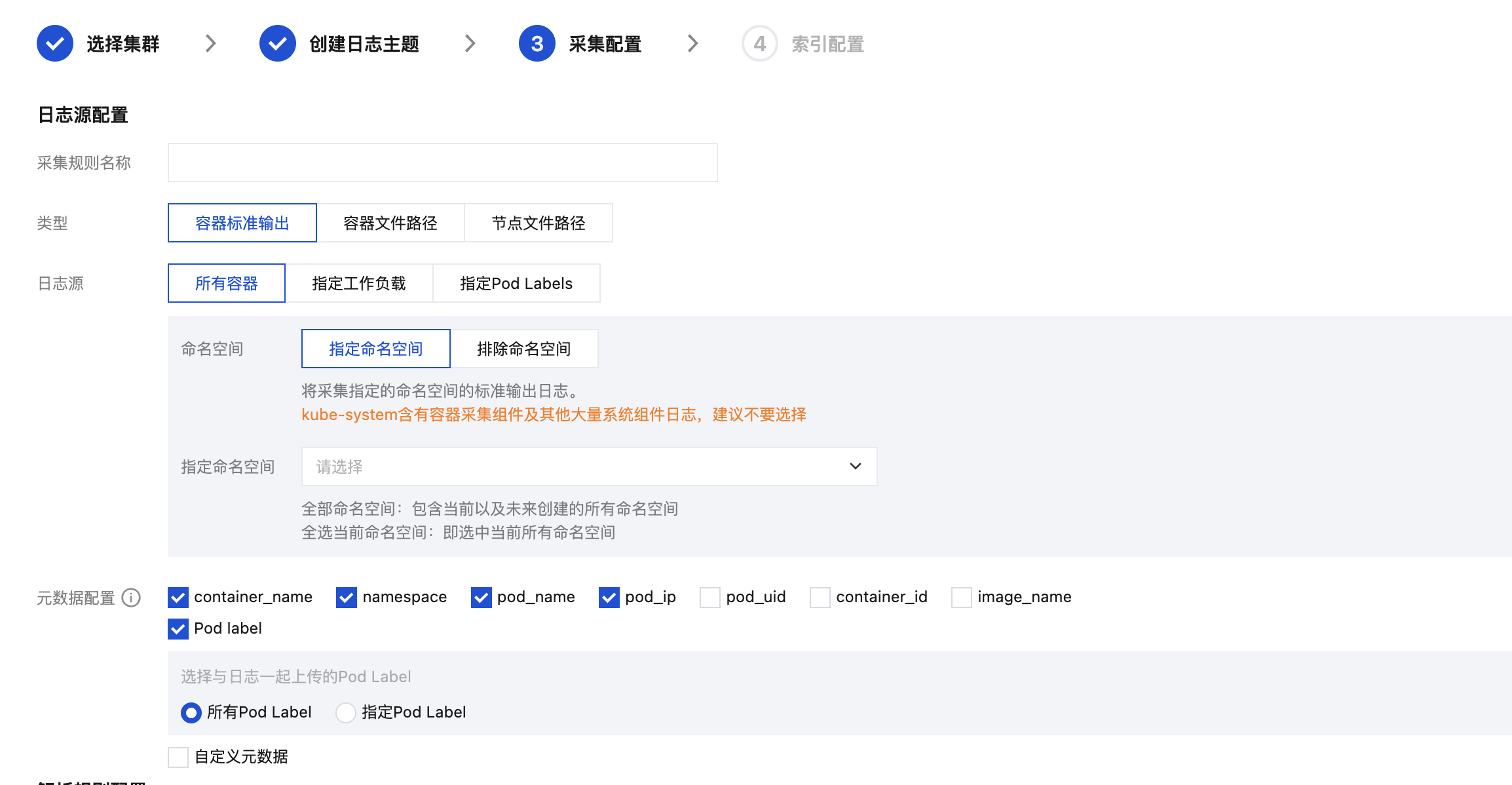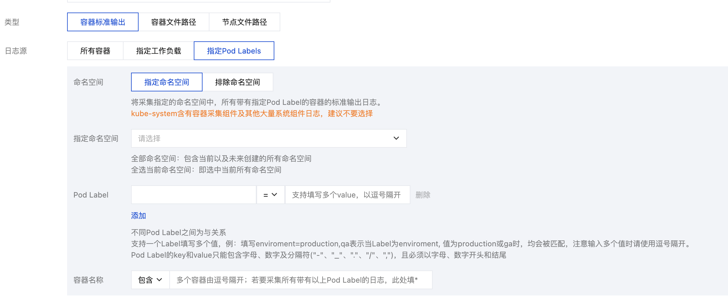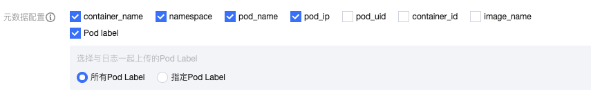 pod_lable_{label name} | 日志所属 pod 的 label(例如一个 pod 带有两个 label:app=nginx,env=prod,则在上传的日志会附带两个 metadata:pod_label_app:nginx,pod_label_env:prod)。 |