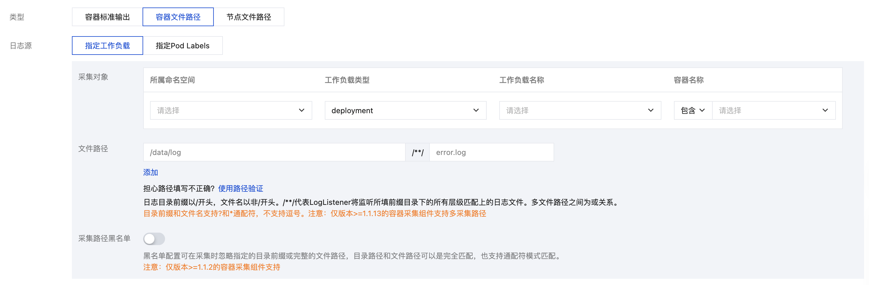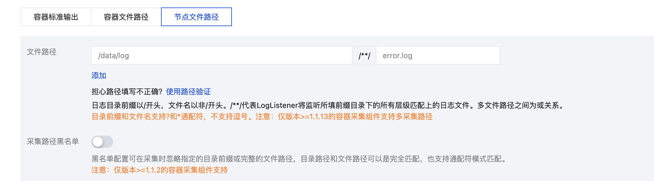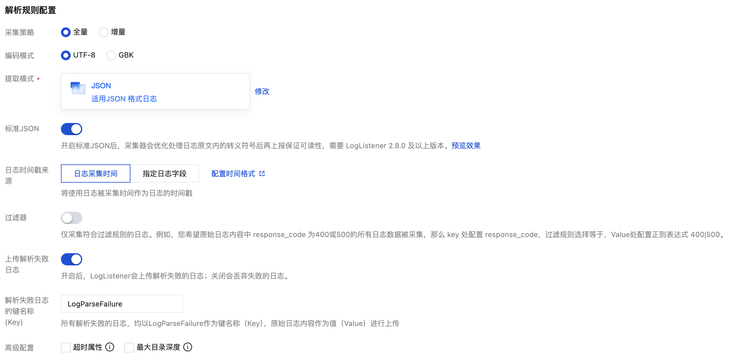 最大目录深度 | 该配置控制日志采集的最大目录深度。LogListener 不会采集所在目录层级超过指定最大目录深度的日志文件。当您目标采集路径包含模糊匹配时,建议配置合适的最大目录深度,避免 LogListener 性能浪费。 | 大于0的整数。0代表不进行子目录的下钻 |