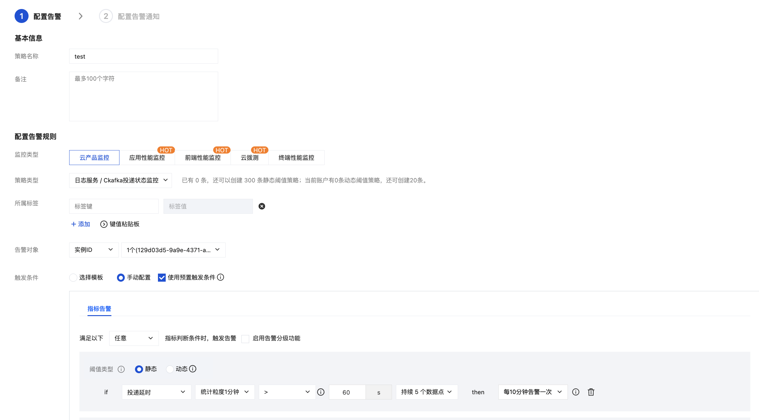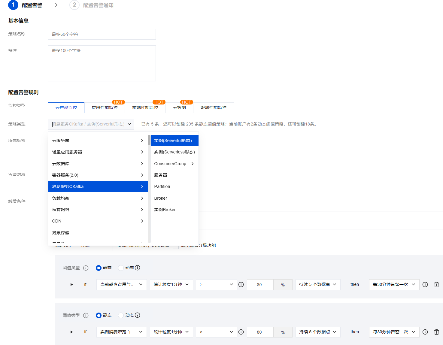 策略类型选择消息服务 Ckafka/实例。实例的形态(serverful/severless)可前往 实例列表,在实例的基本信息中查询。 告警对象选择您的 CKafka 实例。