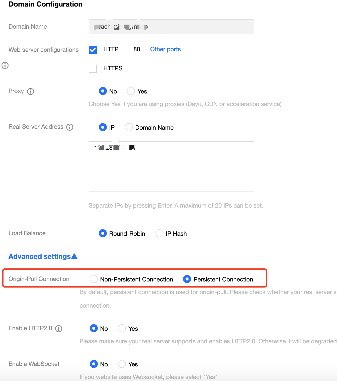 如果源站有多个回源 IP 可以根据实际需要选择回源负载均衡策略,当前策略支持按照客户请求进行轮询(同一个访问源 IP 的请求按照顺序转发到不同的源站服务器)或 IP Hash(同一个访问源 IP 的请求回源到一个台源站服务器),默认为轮询。