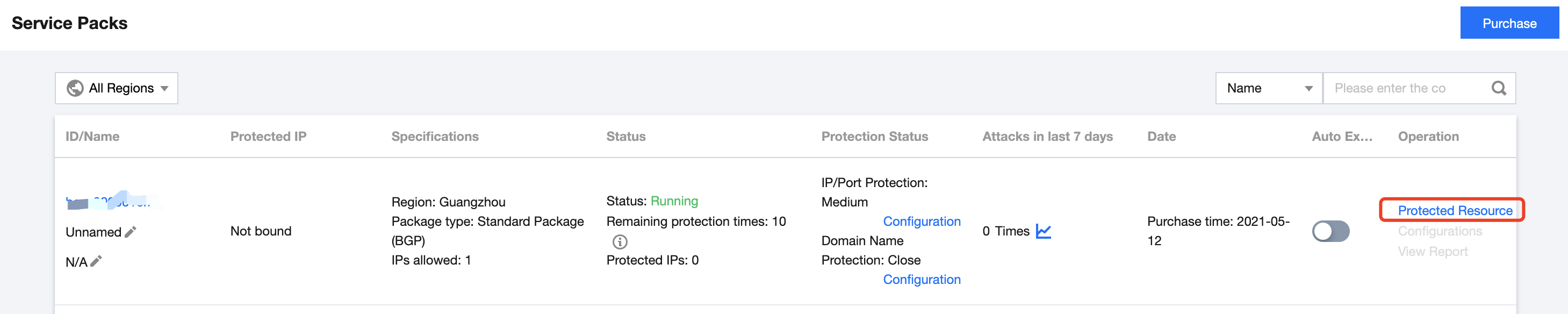 2. 选择目的高防包实例所在地域,并在目的高防包实例所在行的右侧操作栏,单击管理防护对象。