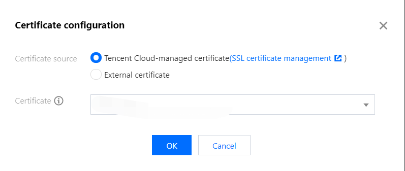 5. 选择证书来源为“腾讯云托管证书”,Web 应用防火墙会自动关联该域名的可用证书,配置完成后,单击保存。