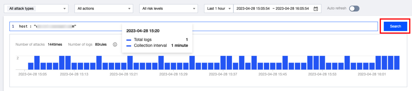 自动刷新 | 定时自动刷新当前页面,默认为关闭;若开启开关,您可选择按照时间范围刷新当前页面,获取最新攻击日志数据。 |