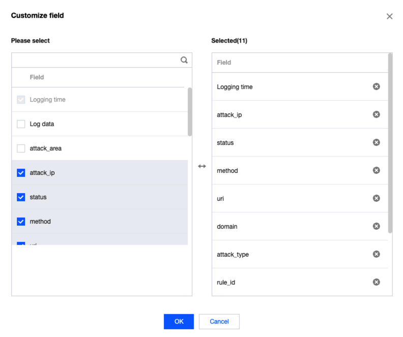 攻击类型 | 支持多选,默认为全部攻击类型,攻击类型包括各个安全模块产生的观察和拦截日志。 |