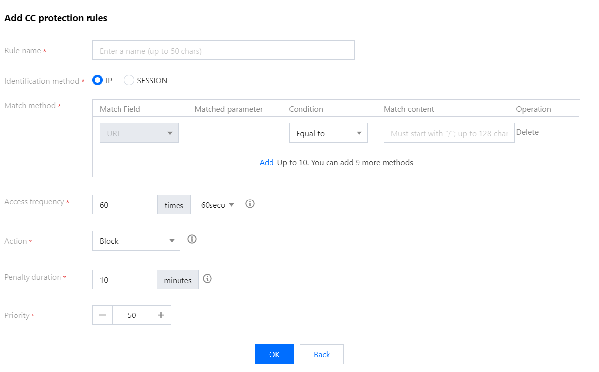 4. 在添加 CC 防护规则弹窗中,填写相应信息。