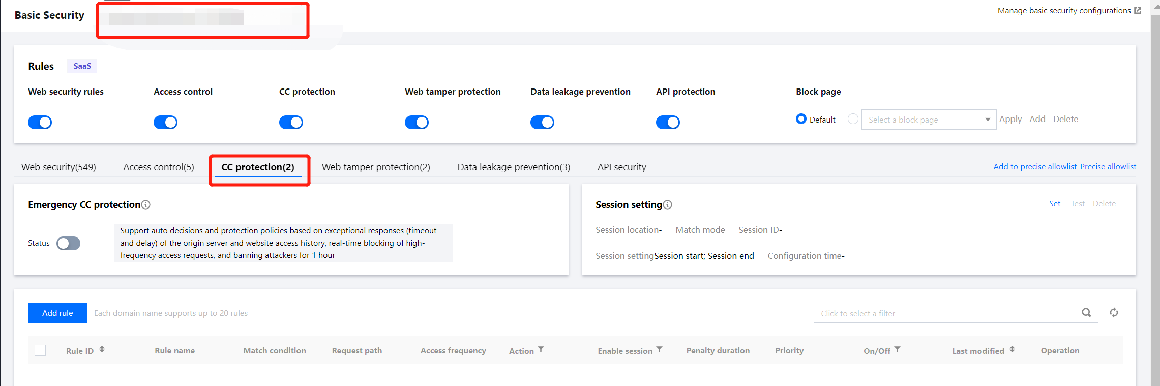 2. 在基础安全页面,左上角选择需要防护的域名,单击 CC 防护,进入 CC 防护页面。