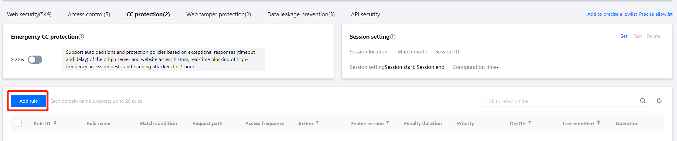3. 在 CC 防护页面,单击添加规则,弹出添加 CC 防护规则弹窗。