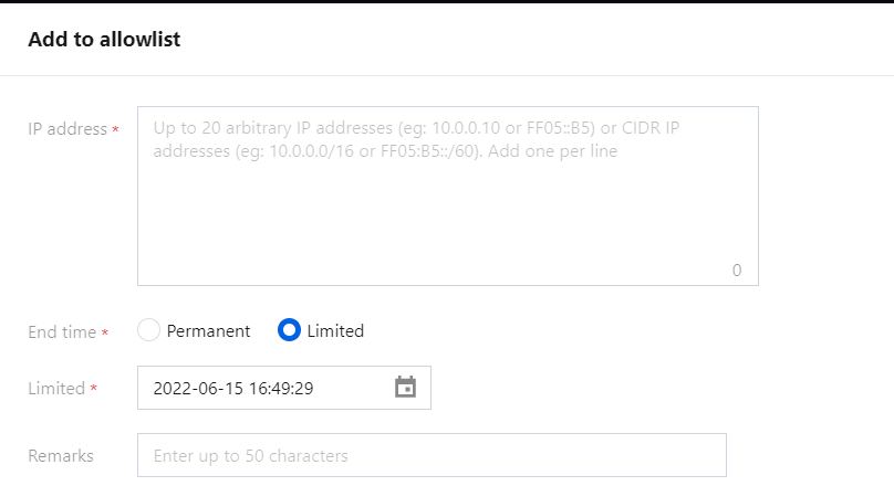 IP 地址:支持任意 IP 地址,例如10.0.0.10或 FF05::B5;支持 CIDR 格式地址,例如10.0.0.0/16或 FF05:B5::/60,使用换行符进行分隔,一次最多添加20个。