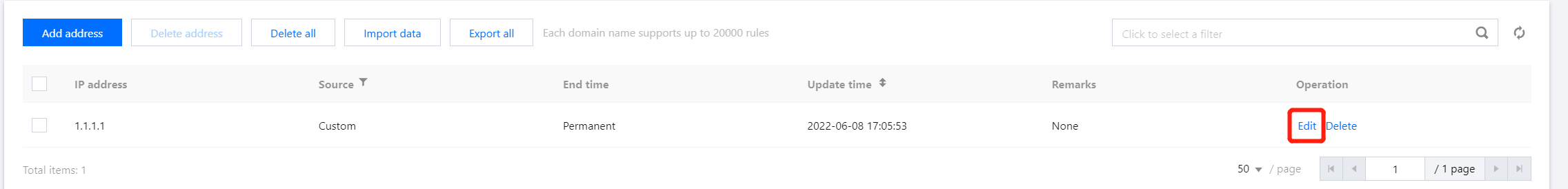 1. 在 黑白名单页面,左上角选择需要防护的域名,单击 IP 白名单,进入 IP 白名单页面。 2. 在 IP 白名单页面,选择所需 IP 地址,单击操作列的编辑,修改截止时间和备注,单击确定保存。