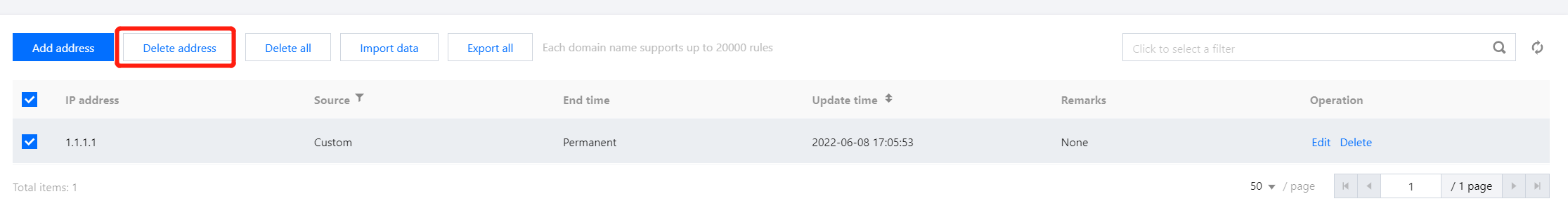 1. 在 黑白名单页面,左上角选择需要防护的域名,单击 IP 白名单,进入 IP 白名单页面。 2. 在 IP 白名单页面,支持删除单个、部分、全部地址,具体操作如下: