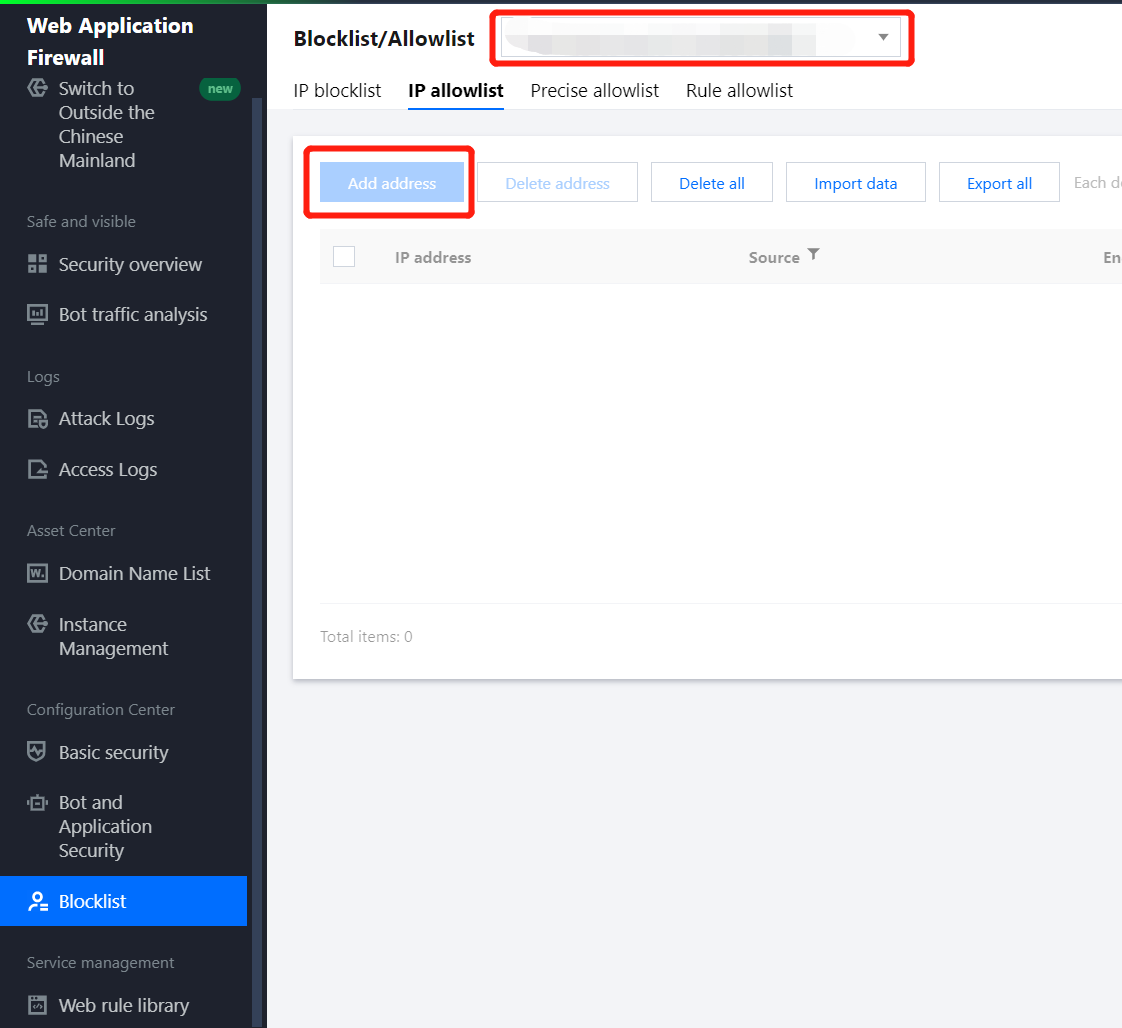 3. 在 IP 白名单页面,单击添加地址,进入添加白名单页面。