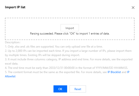 1. 在 黑白名单页面,左上角选择需要防护的域名,单击 IP 白名单,进入 IP 白名单页面。 2. 在 IP 白名单页面,单击导入数据 > 导入,解析成功后,单击确认导入即可。